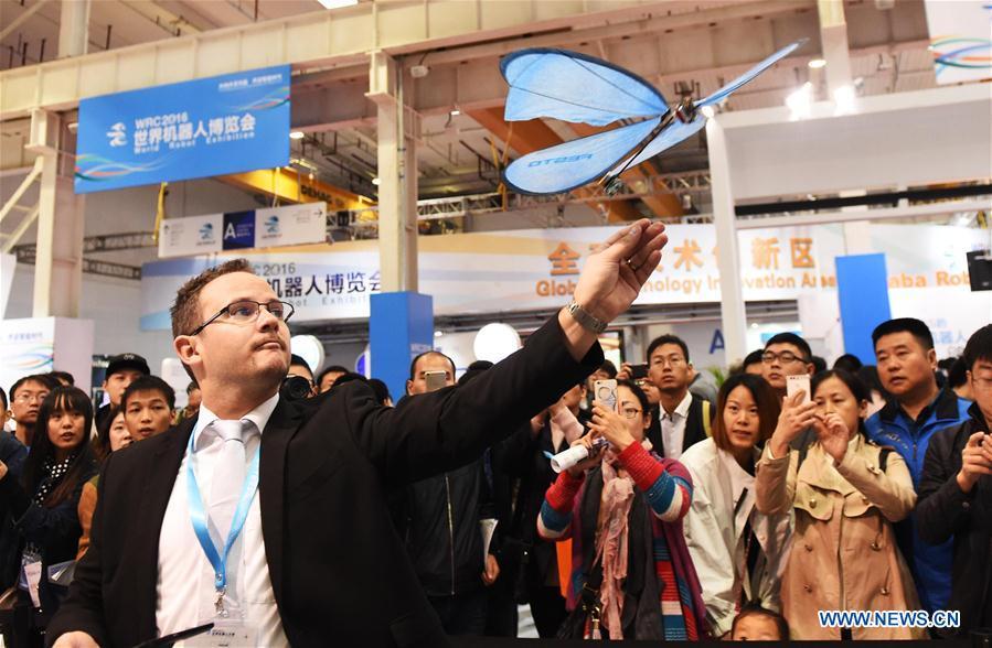 Visitors view an intelligent robot at the 2016 World Robot Exhibition in Beijing, capital of China, Oct. 21, 2016. The exhibition is held from Oct. 21 to 25 as part of the World Robot Conference. (Photo:Xinhua/Li Wen)