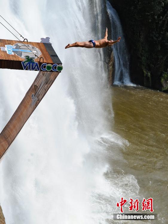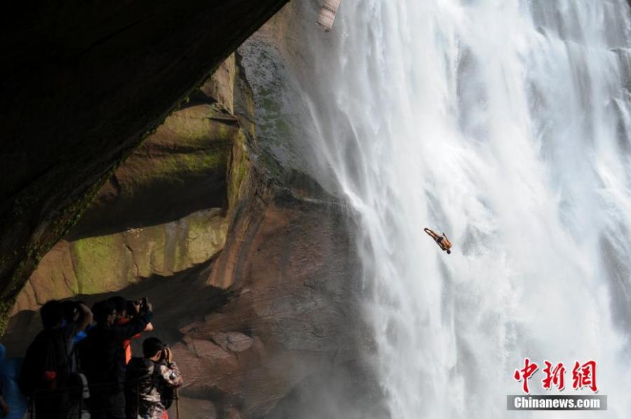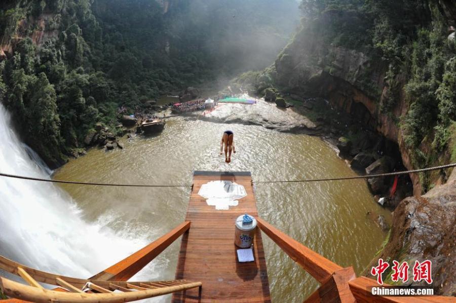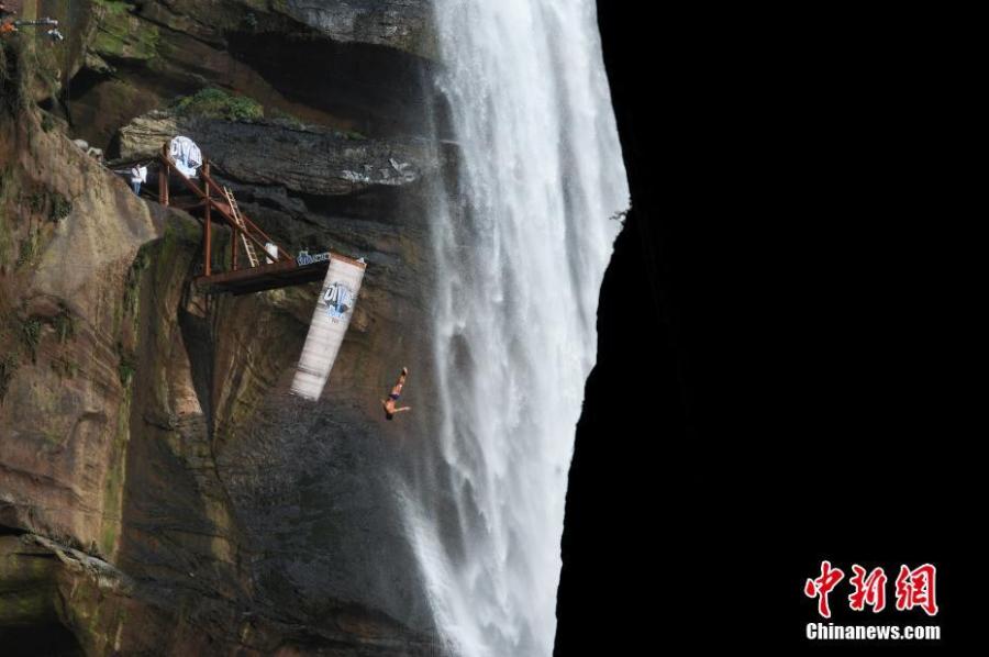 A diver jumps from a 27-meter high platform at the Chishui fall in southwest China's Guizhou Province. An extreme diving competition was held in Guizhou on Oct. 22, 2016. Twelve divers from 10 countries attended this competition. (Photo/China News Service)