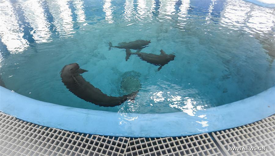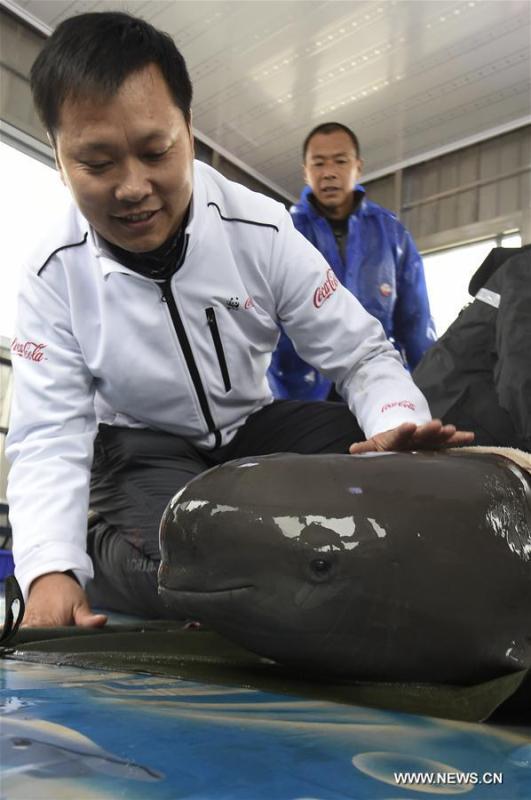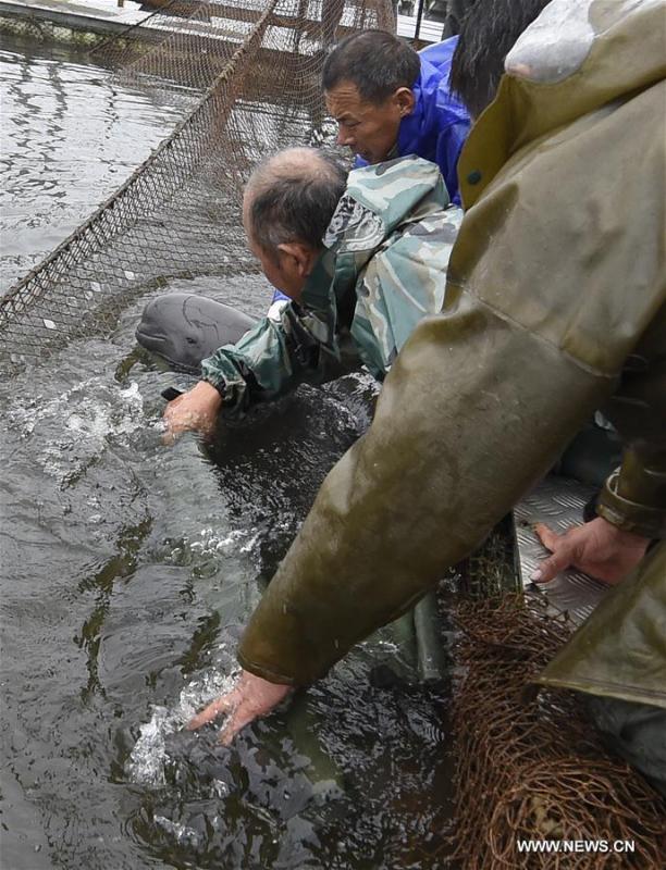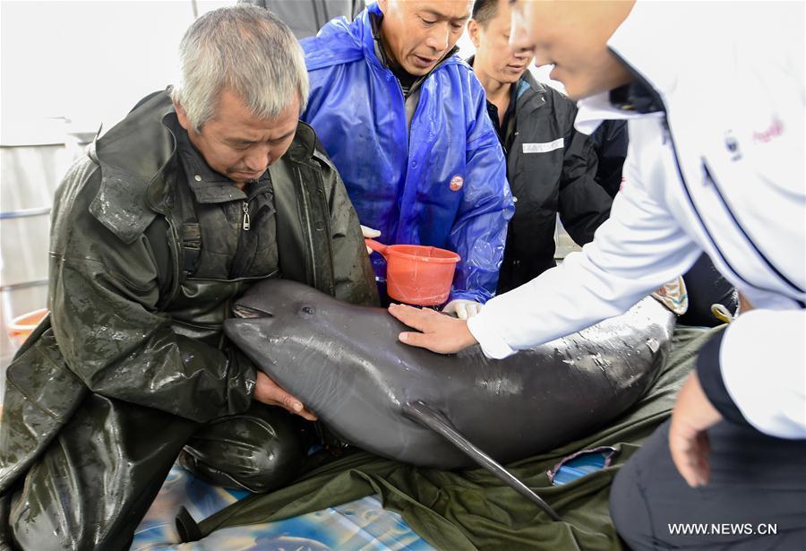 Volunteer Xie Shoujun (1st L) helps staff members to check a finless porpoise named as Tiantian at a national nature reserve in Shishou, central China's Hubei Province, Oct. 24, 2016. There are only around 1,000 finless porpoises, a dolphin-like freshwater mammal with iconic "grins" on the face, in the Yangtze River and two lakes that are linked to the busy waterway. (Photo/Xinhua)