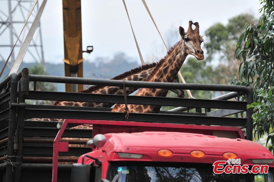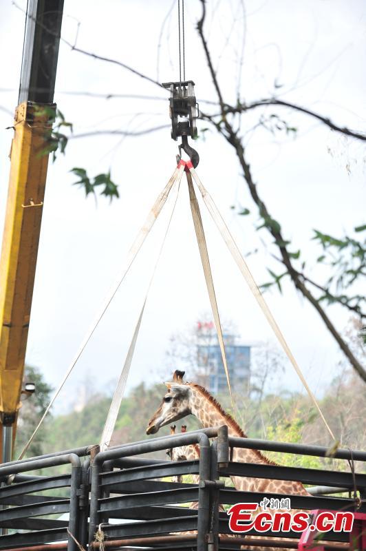 A crane is used to move a giraffe to its new home at the Yunnan Wildlife Zoo in Kunming City, capital of Southwest China's Yunnan Province, October 25, 2016. The zoo moved giraffes with a crane and trucks. (Photo: China News Service/Liu Ranyang)