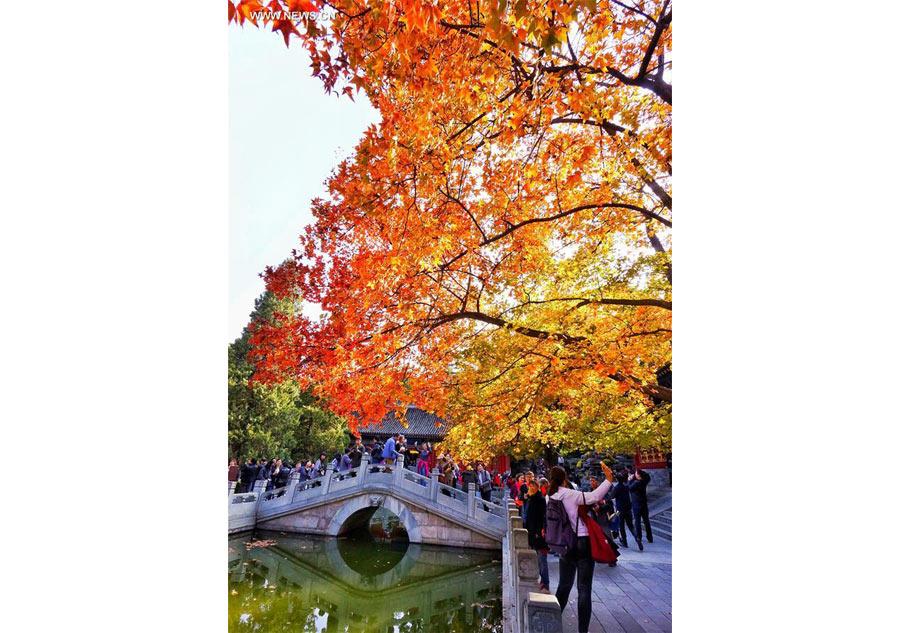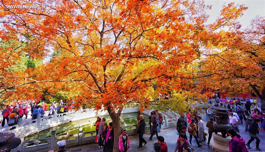 A tourist takes photos of red leaves at Xiangshan park in Beijing, capital of China, Oct. 26, 2016. The autumn scenery in Xiangshan attracts lots of tourists each year. (Photo/Xinhua)