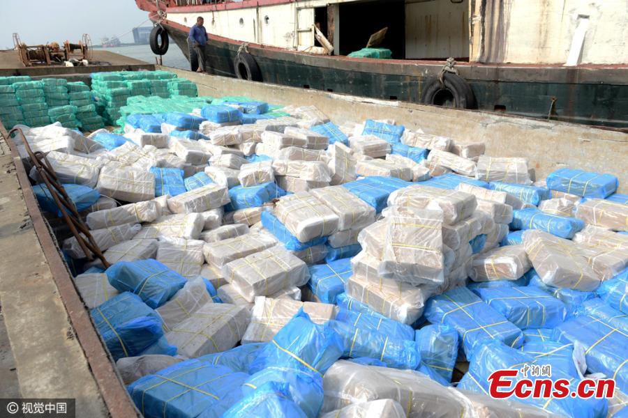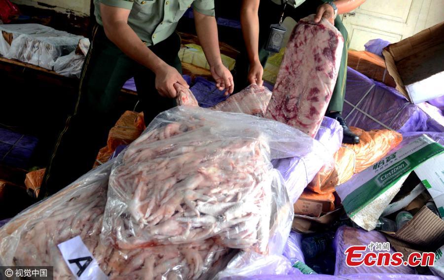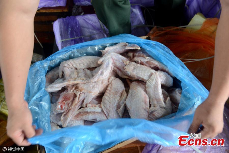 Police show frozen meat, including beef and chicken legs seized in a campaign against smuggling on the Pearl River, in Zhongshan City, South China’s Guangdong Province, Oct. 27, 2016. The meat weighed 200 tons and had a market value of 5.3 million yuan ($780,000). (Photo/CFP)