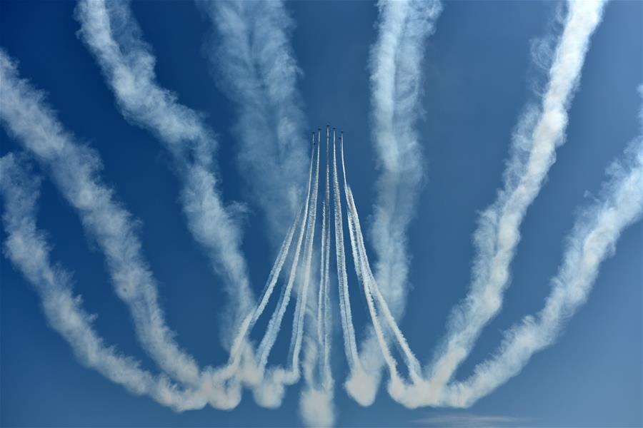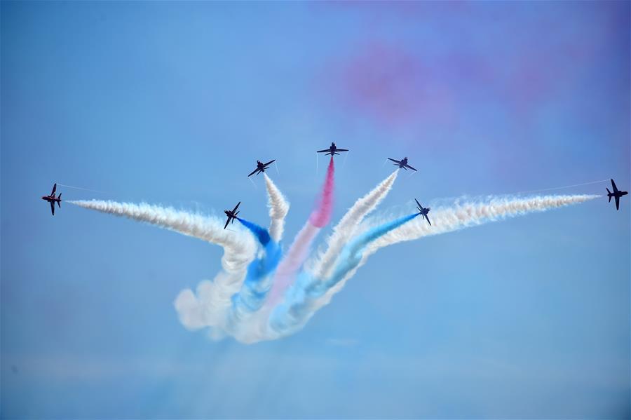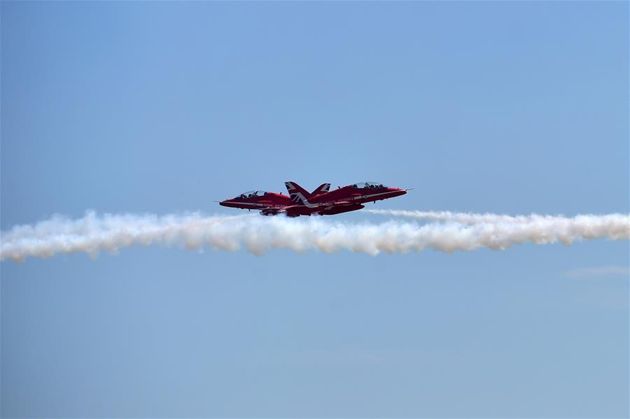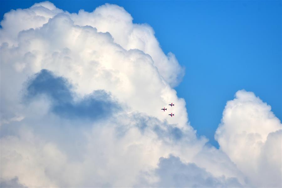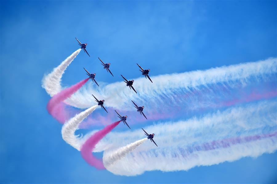 Britain's Royal Air Force aerobatic team Red Arrows perform in Zhuhai, south China's Guangdong Province, Oct. 27, 2016. The Red Arrows arrived in China for their first ever visit on Oct. 22 and they are scheduled to perform at the 11th China International Aviation and Aerospace Exhibition, in Zhuhai, in the first week of November. (Photo/Xinhua)