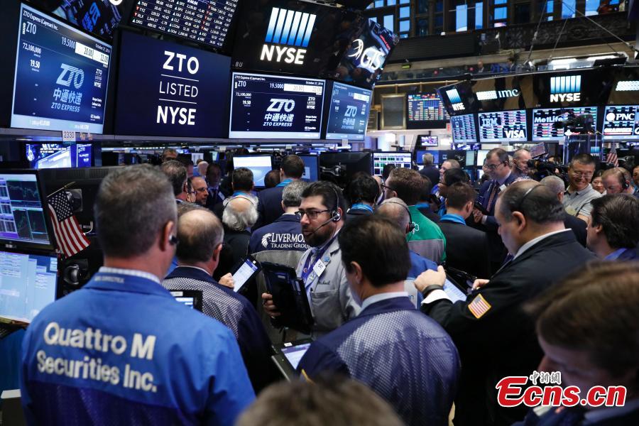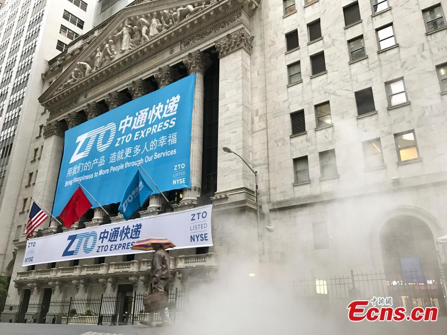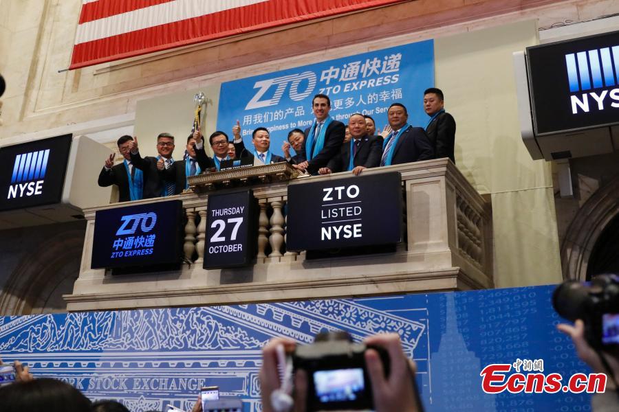 ZTO Express Founder, Chairman and CEO Lai Meisong, joined by members of the company's leadership team, rings a ceremonial bell as his company's IPO begins trading, on the floor of the New York Stock Exchange, Oct. 27, 2016. ZTO's IPO, which had been expected to raise $1.33 billion, raised $1.4 billion on Wednesday night. (Photo: China News Service/Liao Pan)