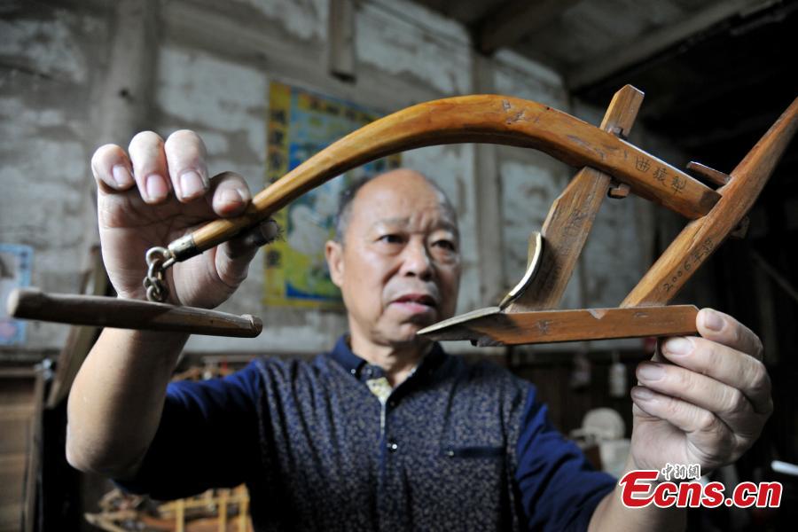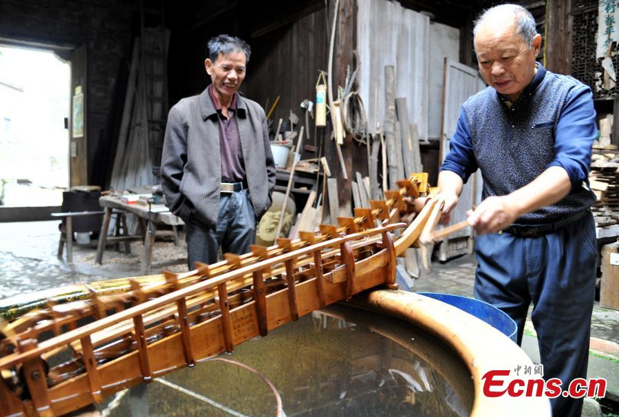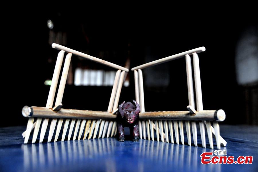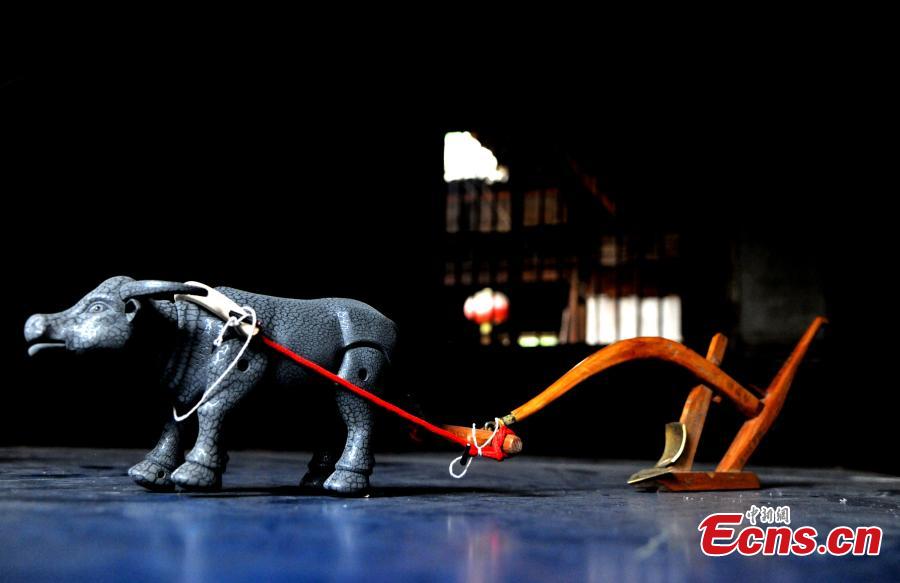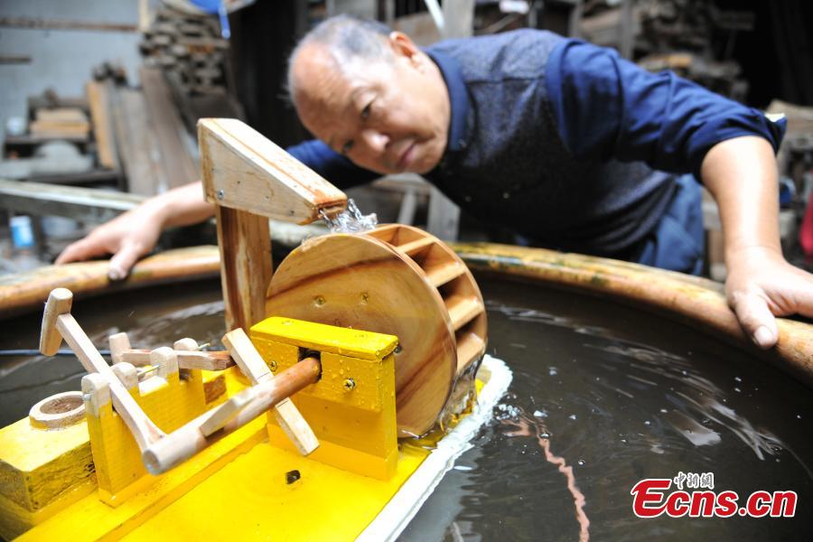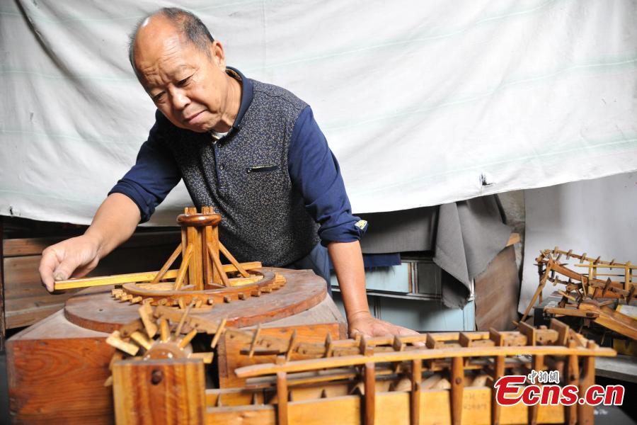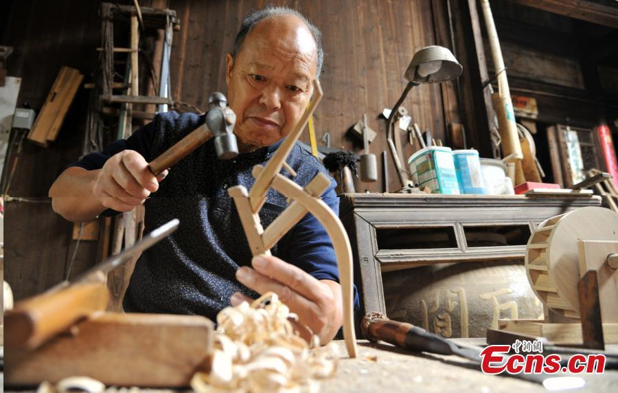 Carpenter Guo Xican works on miniature farm implements at his home in Wanzai County, East China’s Jiangxi Province, Oct. 27, 2016. Guo said he created the miniatures as a personal interest and to also let future generations know farming history. (Photo: China News Service/Wang Haoyang)