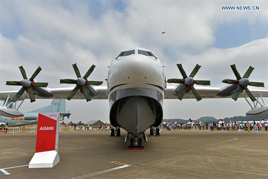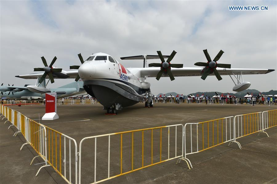 An amphibious aircraft AG600 is displayed for the 11th China International Aviation and Aerospace Exhibition in Zhuhai, south China's Guangdong Province, Oct. 30, 2016. The AG600 is by far the world's largest amphibian aircraft, about the size of a Boeing 737. (Photo/Xinhua)