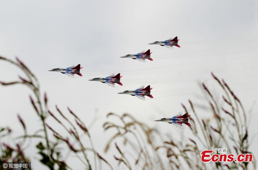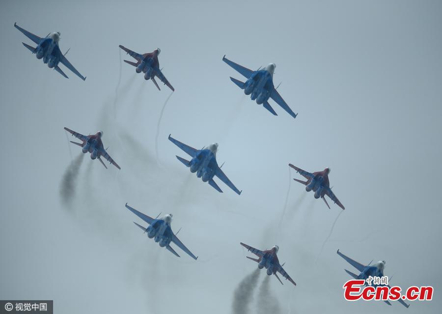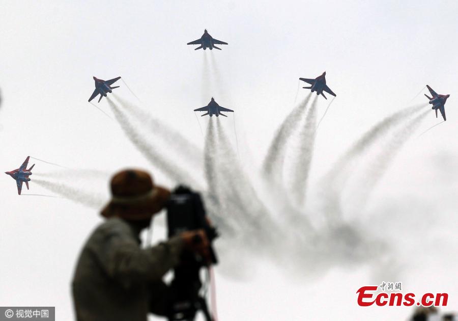 Aerobatic teams from the Russian Air Force, composed of Su-27 and MiG-29 warplanes, rehearse for the 11th China International Aviation and Aerospace Exhibition, or Airshow China, in Zhuhai City, South China’s Guangdong Province, Oct. 30, 2016. The airshow will run from Nov. 1 to 6 in Zhuhai. (Photo/CFP)