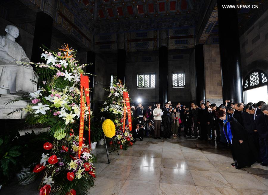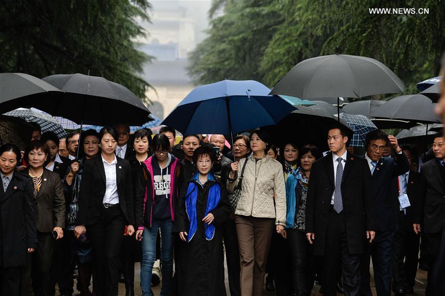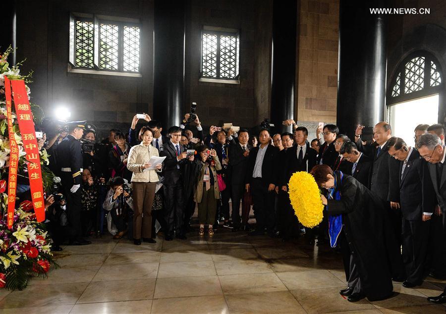 Hung Hsiu-chu (C, front), leader of the Kuomintang (KMT) Party, visits the Sun Yat-sen Mausoleum in Nanjing, capital of east China's Jiangsu Province, Oct. 31, 2016. Hung, who headed a delegation from Taiwan, paid tribute to KMT founder Sun Yat-sen at his mausoleum in Nanjing Monday. (Photo/Xinhua)