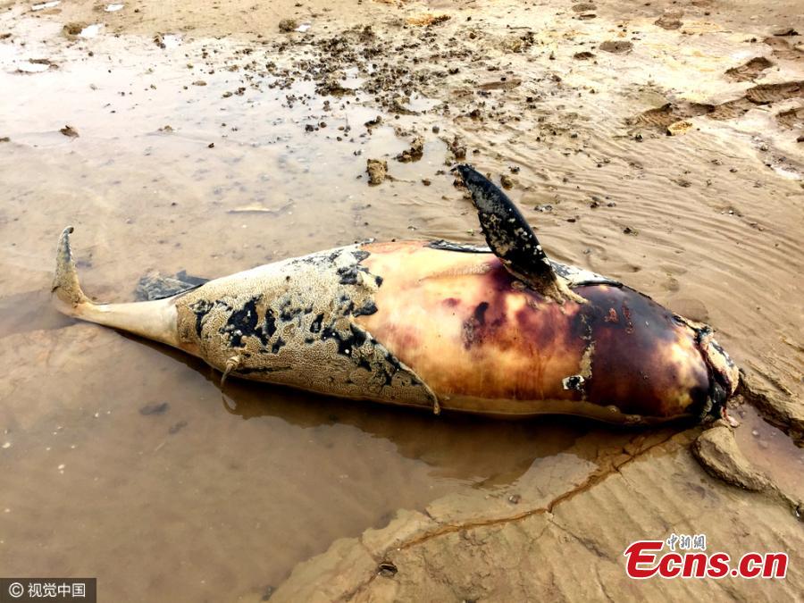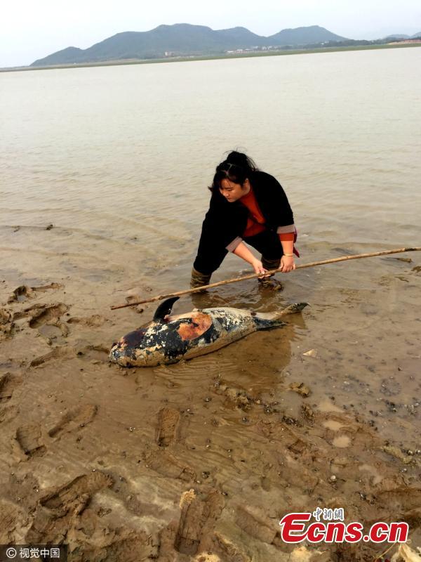 A 1.4-meter-long finless porpoise is found dead in Poyang Lake in Jiujiang, East China’s Jiangxi Province. Experts say dropping water levels in the lake during autumn and winter may cause the endangered mammal to be stranded and die. The animal may also suffer from fatal strike by boat propellers. (Photo/CFP)