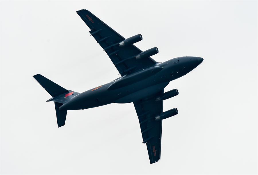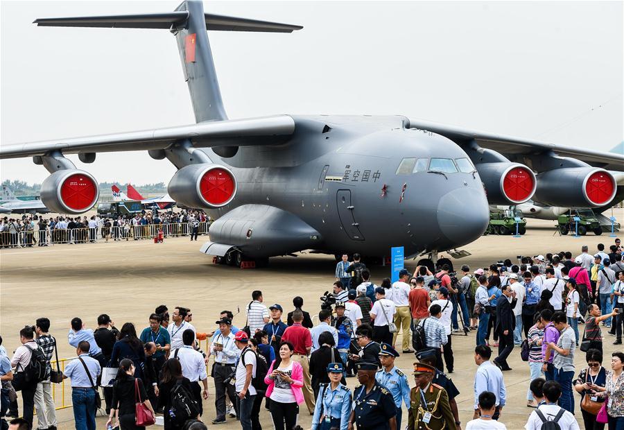 A domestic-built Y-20 heavy transport aircraft flies in the sky at the 11th China International Aviation and Aerospace Exhibition in Zhuhai, south China's Guangdong Province, Nov. 1, 2016. (Photo/Xinhua)