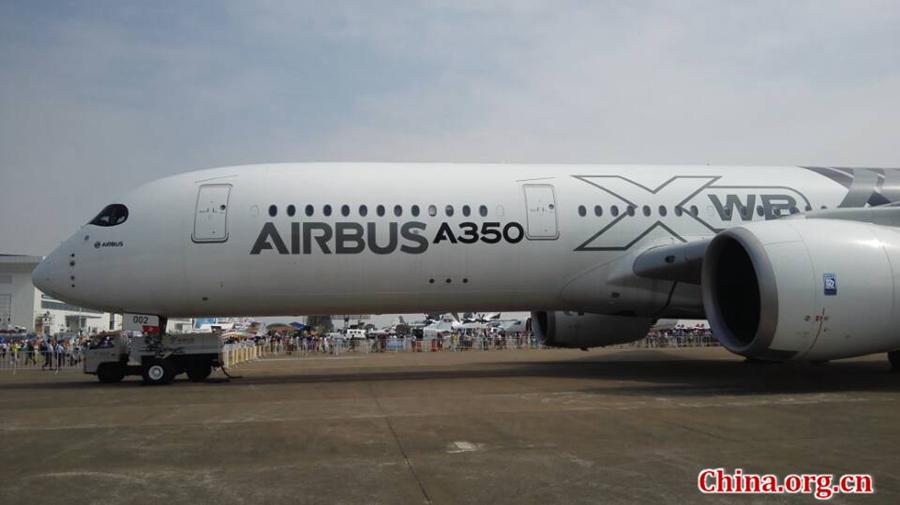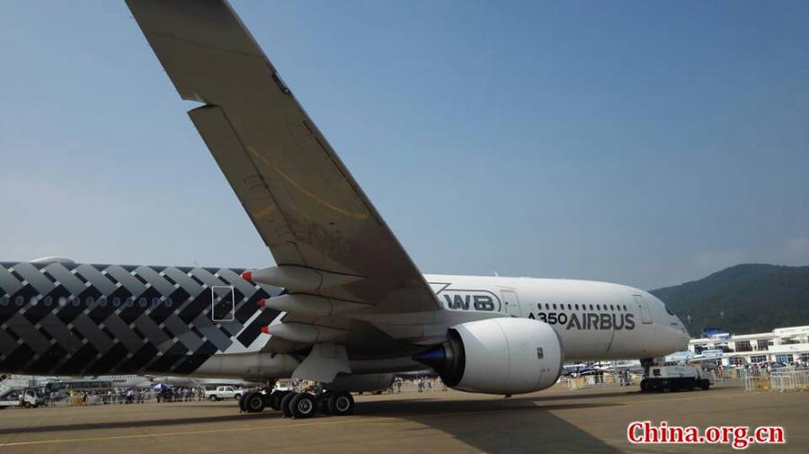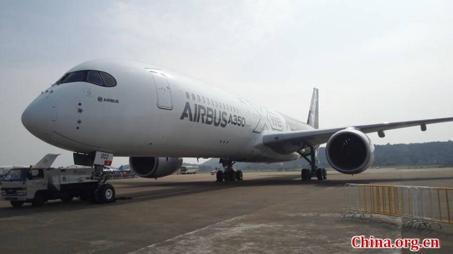 The new A350 XWB passenger plane from Airbus is on display at the Airshow China 2016, held in Zhuhai, Guangdong Province, on Nov. 1-6. (Photo/China.org.cn)