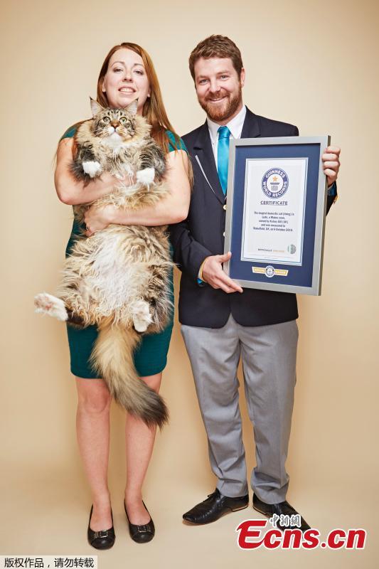 Ludo from Wakefield in South Yorkshire, UK, at 119cm tall, is the world’s longest domestic cat, according to Guinness, which gave the Maine coon appropriately big placement in its new 2017 records book.(Photo/Guinness World Records)
