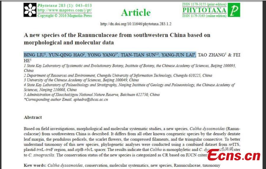 The photo shows flowers of a new species found in Southwest China’s Sichuan province. The news species named “Caltha dysosmoides (Ranunculaceae)” was identified based on field investigations, morphological and molecular systematic studies of three years by Chinese scientists. The new species description was published on “Phytotaxa”, a scientific journal on November 3, 2016. (Photo: China News Service/ Zhang Tao)