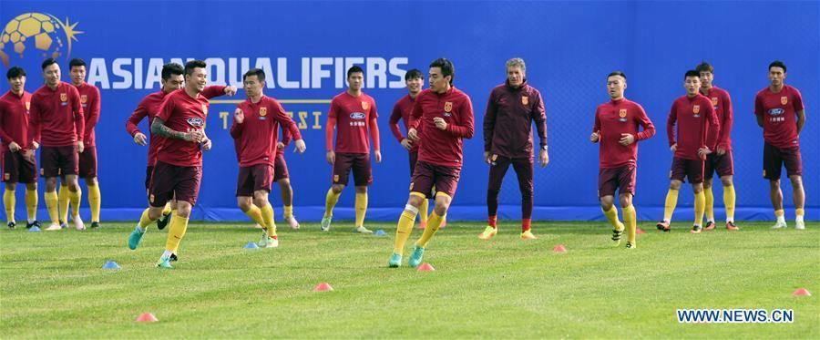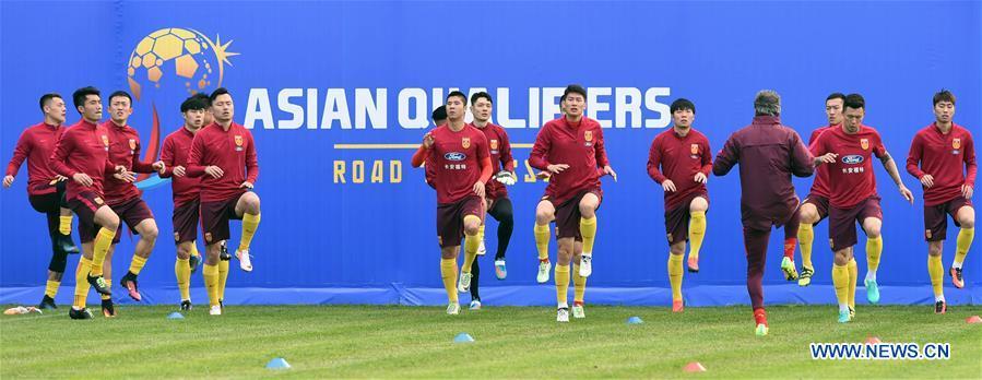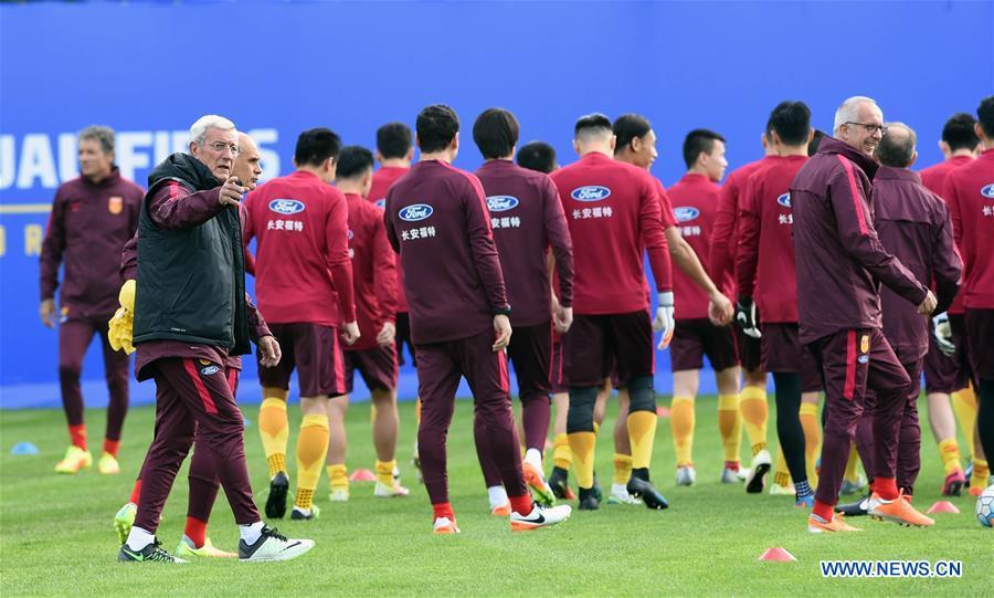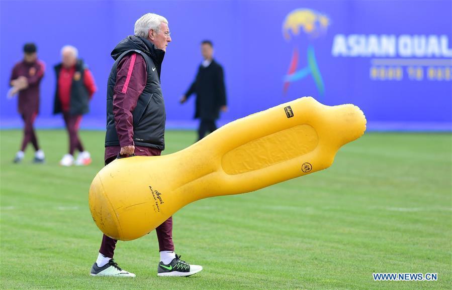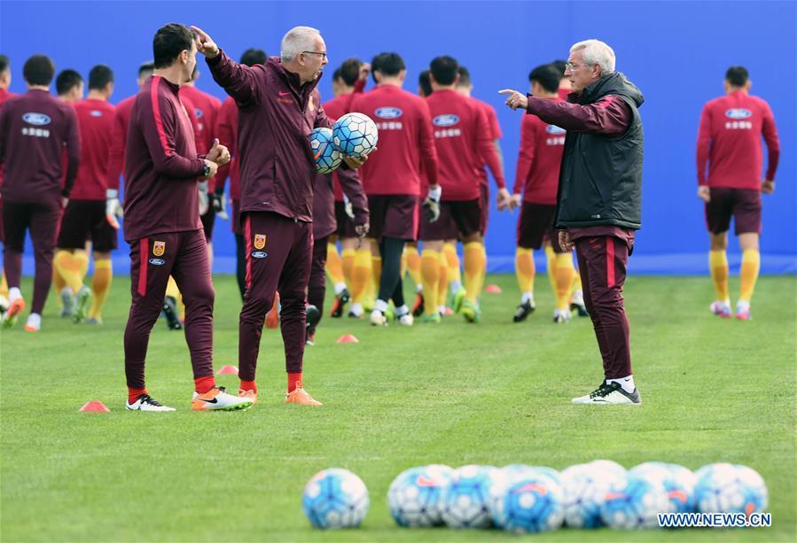 Marcello Lippi, head coach of China's national soccer team, carries the equipment during the training session for the 2018 FIFA World Cup Asian Zone Qualifiers against Qatar at Haigeng training base in Kunming, capital of southwest China's Yunnan Province, on Nov. 3, 2016. (Photo/Xinhua)