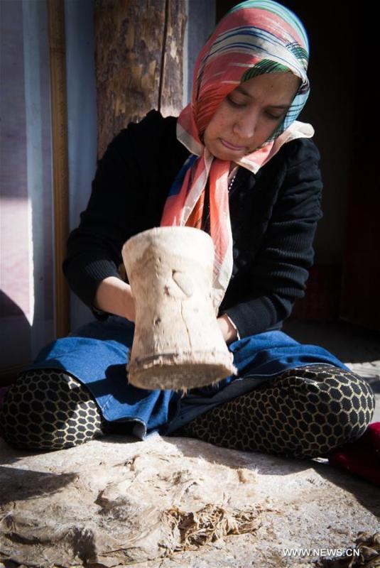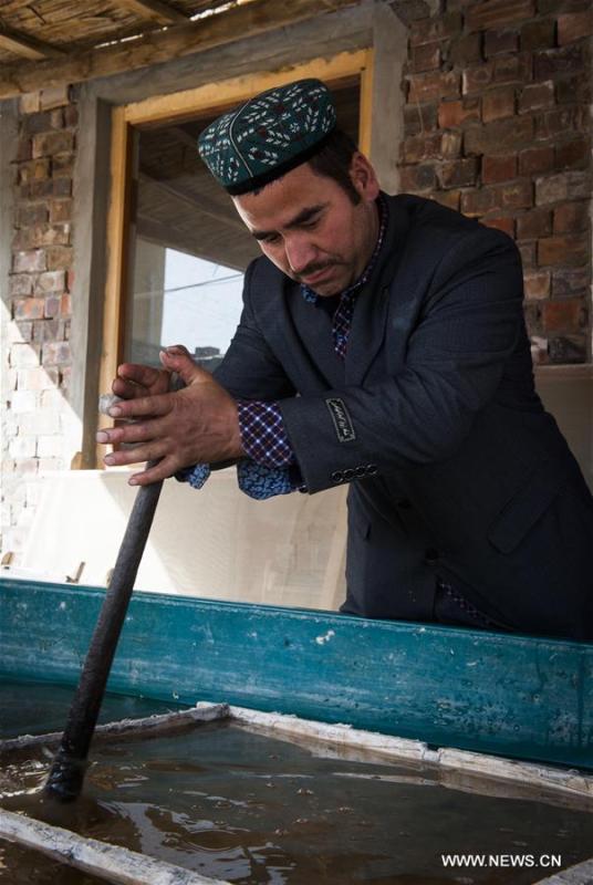 Artists purchase mulberry-bark paper from the shop of heritage inheritor Tohtibakhi (1st R) in Moyu County of Hotan City, northwest Xinjiang Uygur Autonomous Region, Nov. 4, 2016. The handmade mulberry-bark paper, originating thousands of years ago in Xinjiang, has been listed as intangible cultural heritage by the UNESCO. (Photo: Xinhua/Wei Hai)