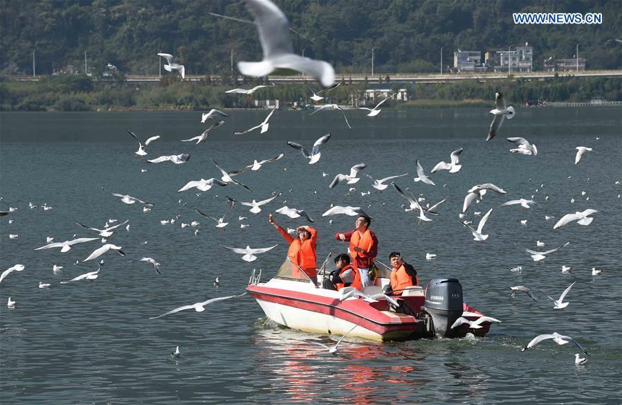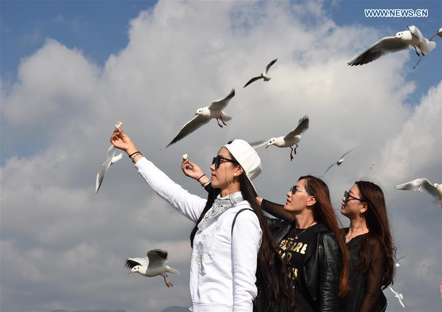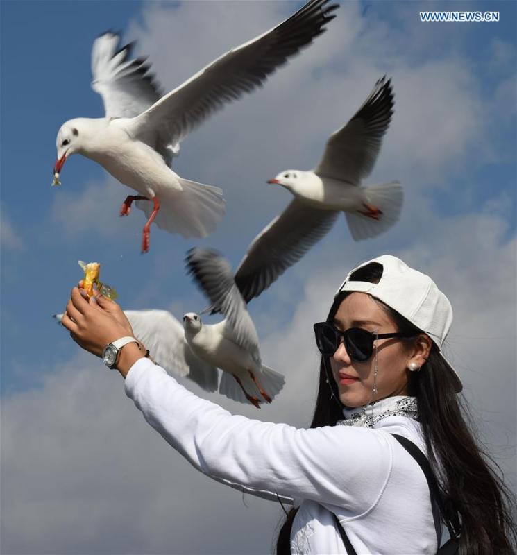 A tourist feeds black-headed gulls at the Dianchi Lake in Kunming, capital of southwest China's Yunnan Province, Nov. 4, 2016. Thousands of black-headed gulls living here have attracted residents and tourists to visit. (Xinhua/Yang Zongyou)