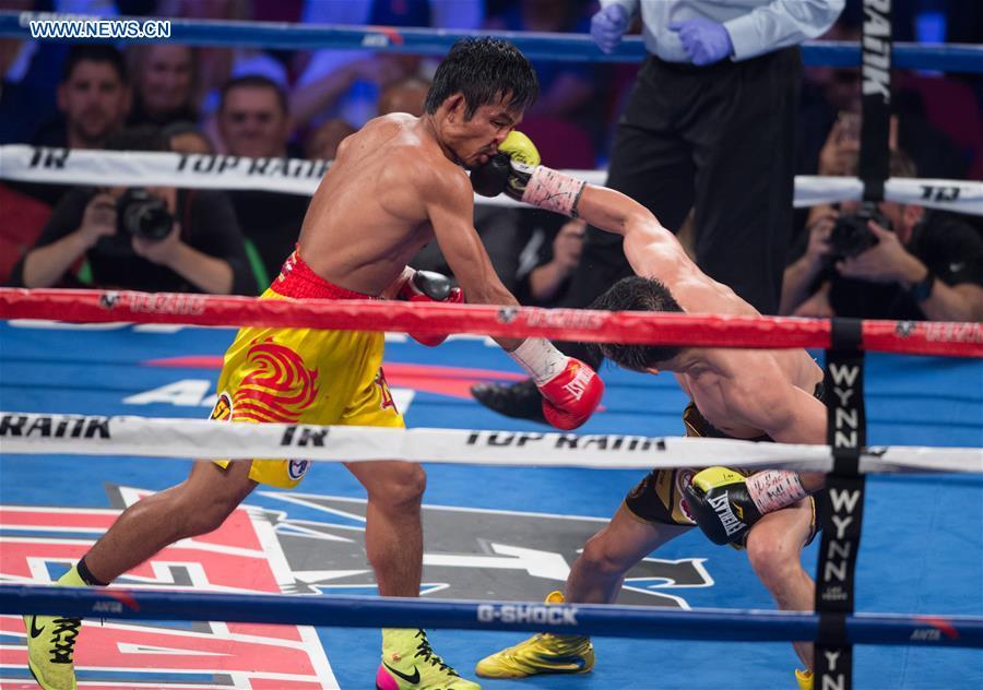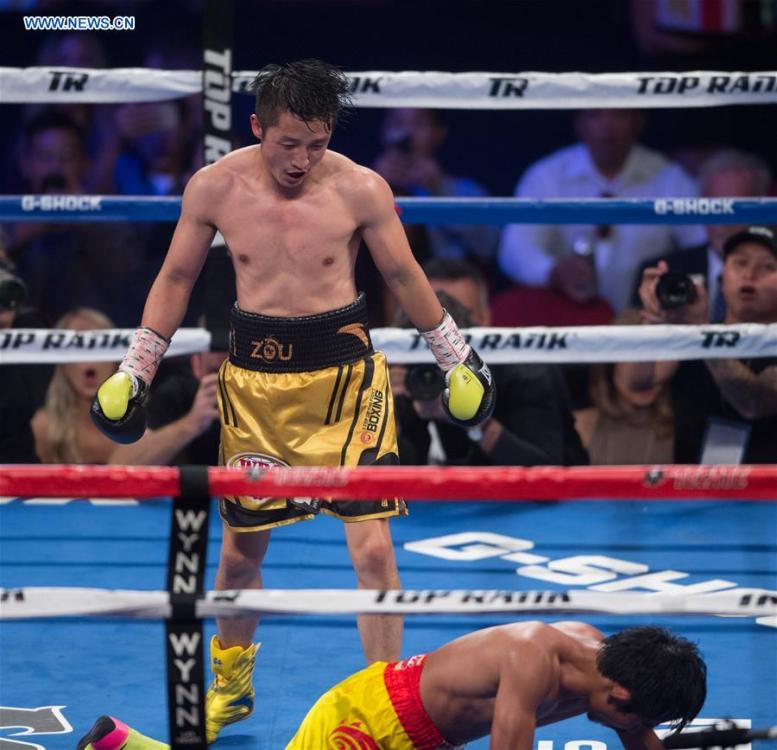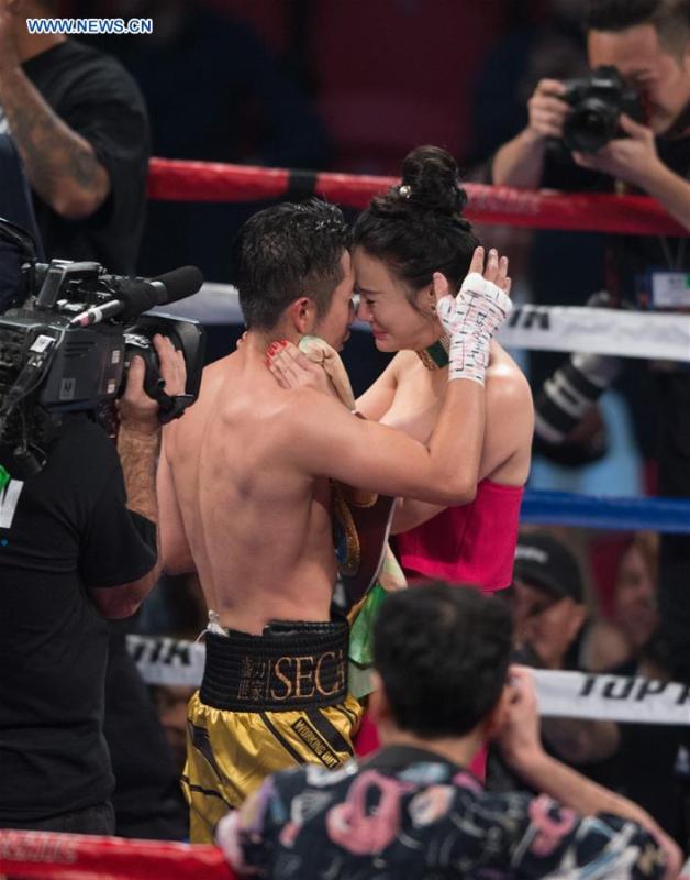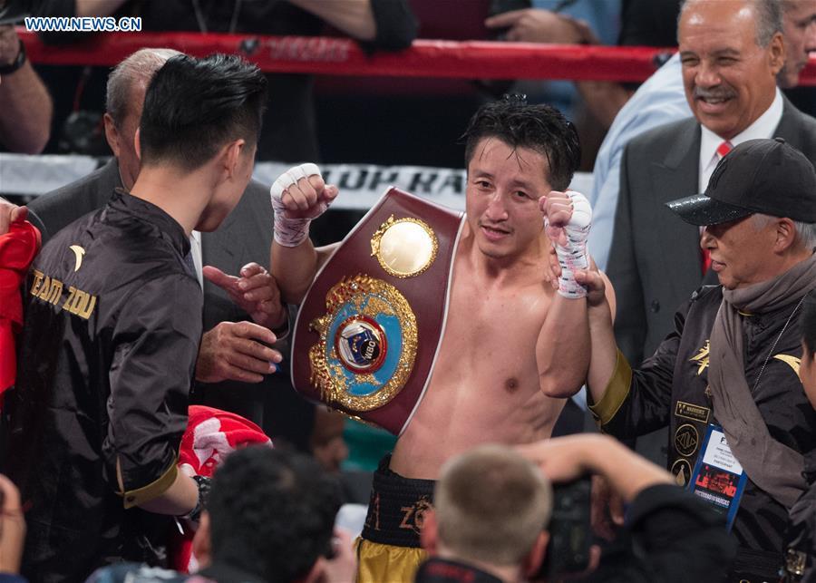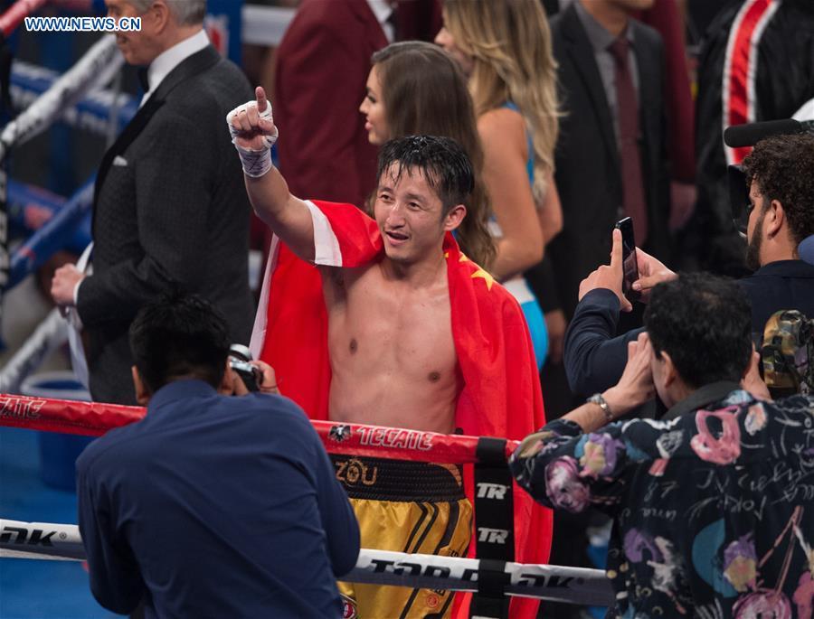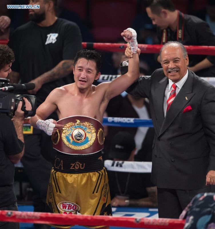 Zou Shiming (C) of China celebrates after defeating Prasitak Phaprom of Thailand in a WBO flyweight title boxing match in Las Vegas, the United States, Nov. 5, 2016. (Photo/Xinhua)