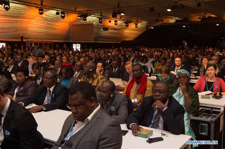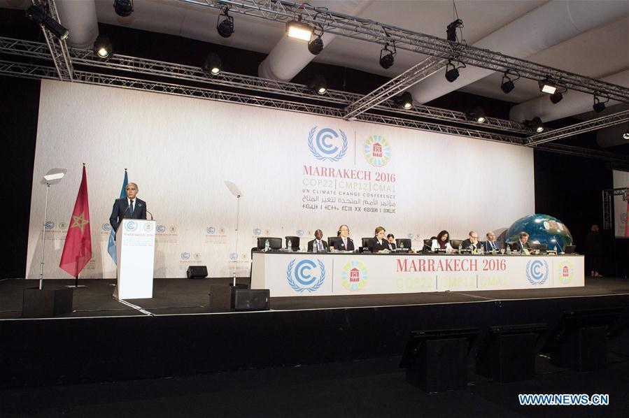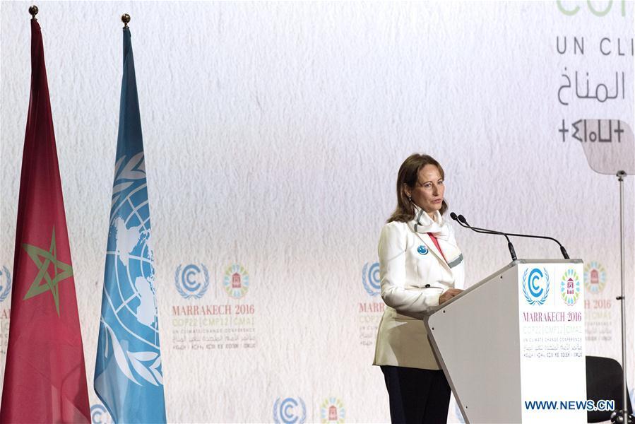 COP21 president Segolene Royal (R) and Morocco's Foreign Affairs Minister Salaheddine Mezouar (L) pose for a photo during the opening ceremony of COP22 in Marrakech, Morocco, Nov. 7, 2016. The 22nd Conference of Parties (COP22) to the United Nations Framework Convention on Climate Change (UNFCCC) kicked off here on Monday. (Xinhua/Meng Tao)