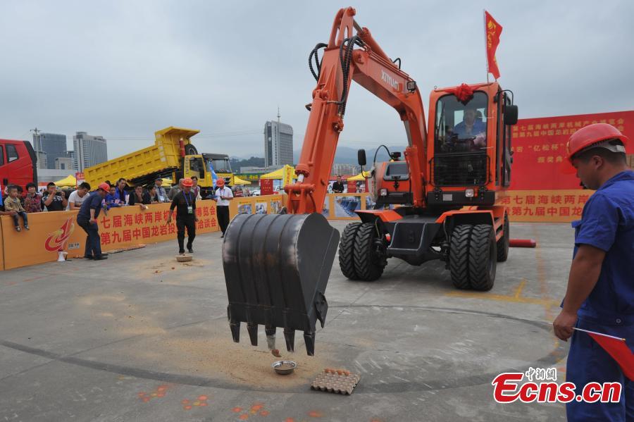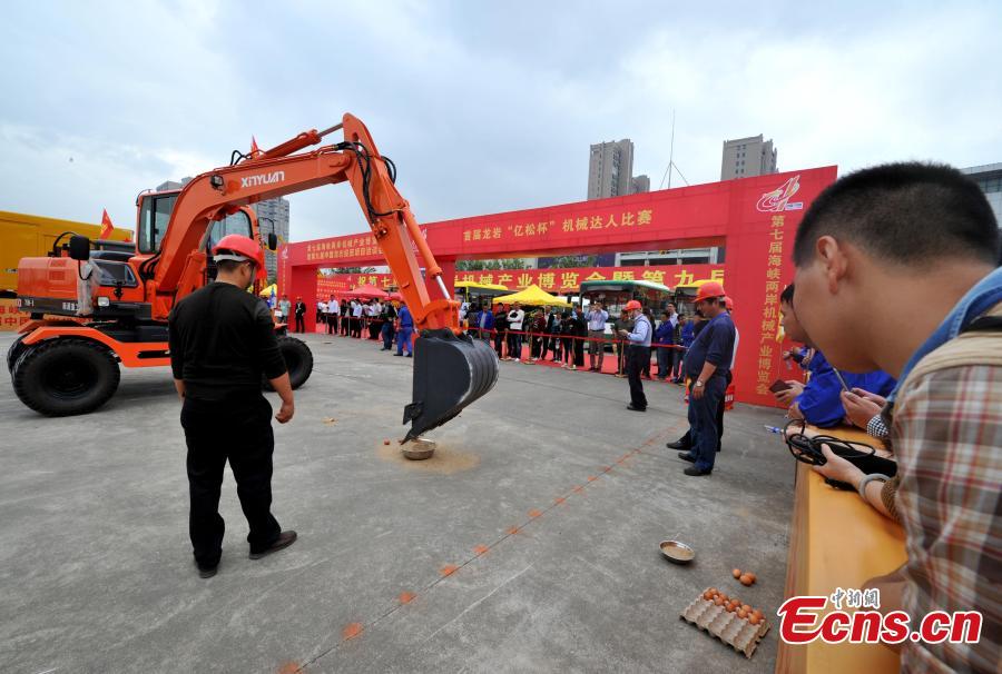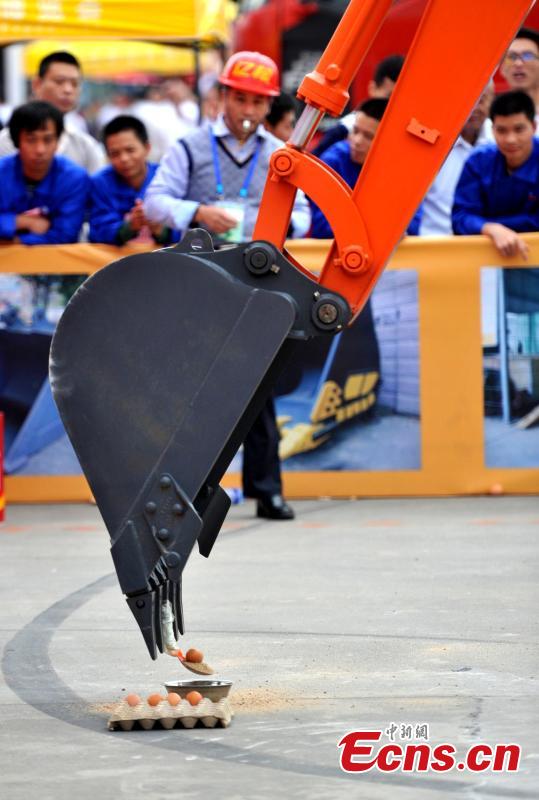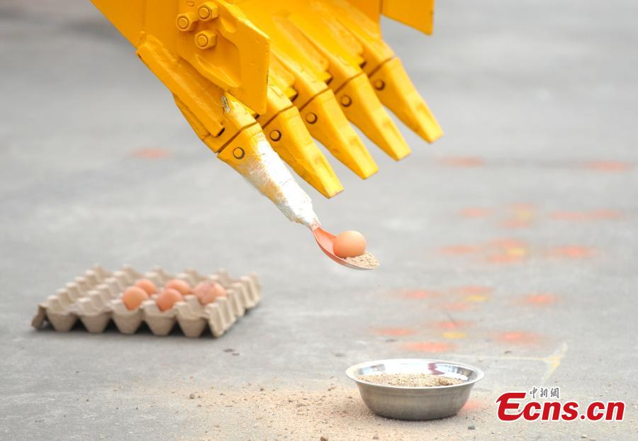 An excavator operator shows his consummate skills by transporting eggs with the giant equipment during a competition in Longyan city, Fujian province on Tuesday, November 8, 2016. (Photo: China News Service/Zhang Bin)