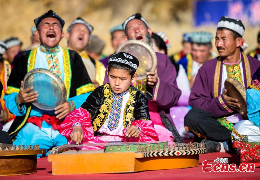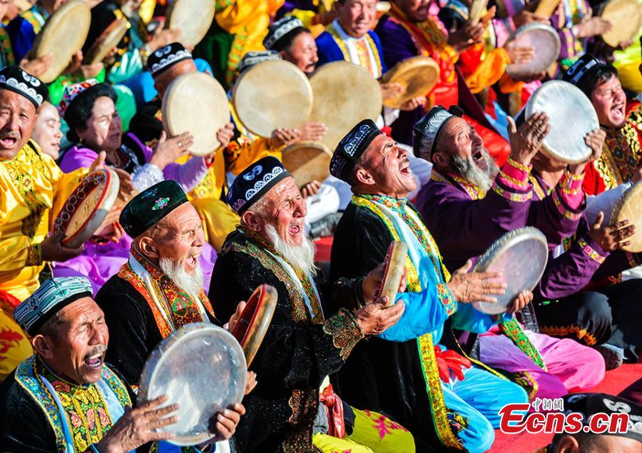 Artists of the Uygur ethnic group gather to perform Daolang Mukam, a traditional art style of singing and dancing, in Bachu County of northwest China's Xinjiang Uygur Autonomous Region, Nov. 8, 2016. (Photo: China News Service/Jin Wei)