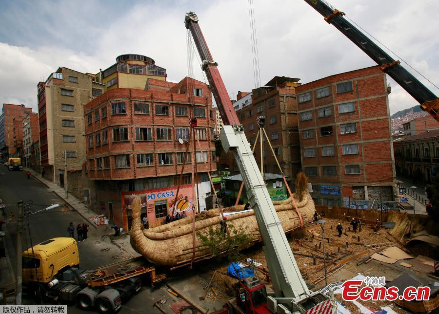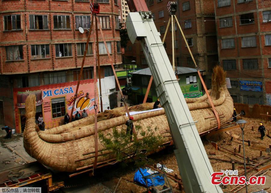 Cranes place 'Viracocha III', a boat made only from totora reeds, on a trailer truck during preparations for the boat to cross the Pacific Ocean, from Chile to Australia on an expected six-month journey, in La Paz, Bolivia, November 8, 2016. (Photo/Agencies)
