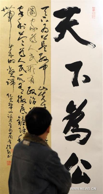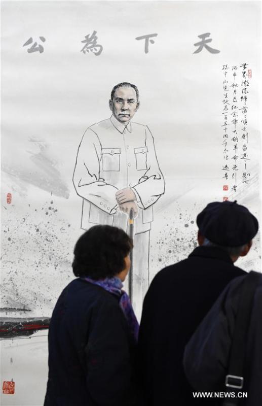 People visit a painting exhibition commemorating the 150th birthday of Sun Yat-sen at the Cultural Palace of Nationalities in Beijing, capital of China, Nov. 8, 2016. The painting exhibition kicked off here on Tuesday. (Photo/Xinhua)