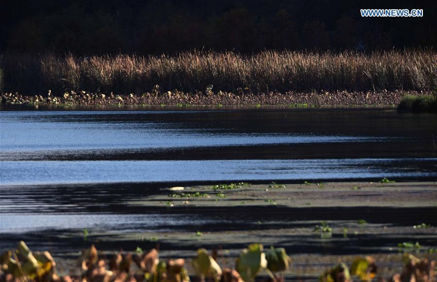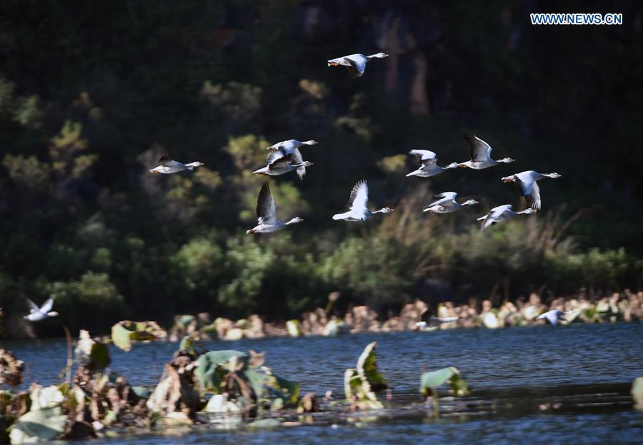 Bar-headed geese fly over the lake in Puzhehei Wetland Park in Qiubei County, southwest China's Yunnan Province, Nov. 11, 2016. Covering an area of over one thousand hectares, Puzhehei Wetland Park is home to over 200 species of birds. (Xinhua/Yang Zongyou)
