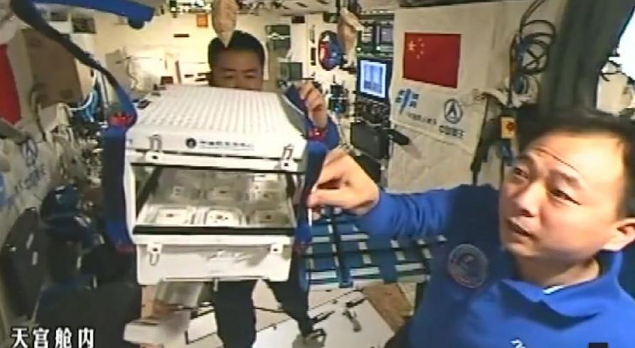 Astronauts take care of the plants in Tiangong-2. (Photo/Xinhua)
