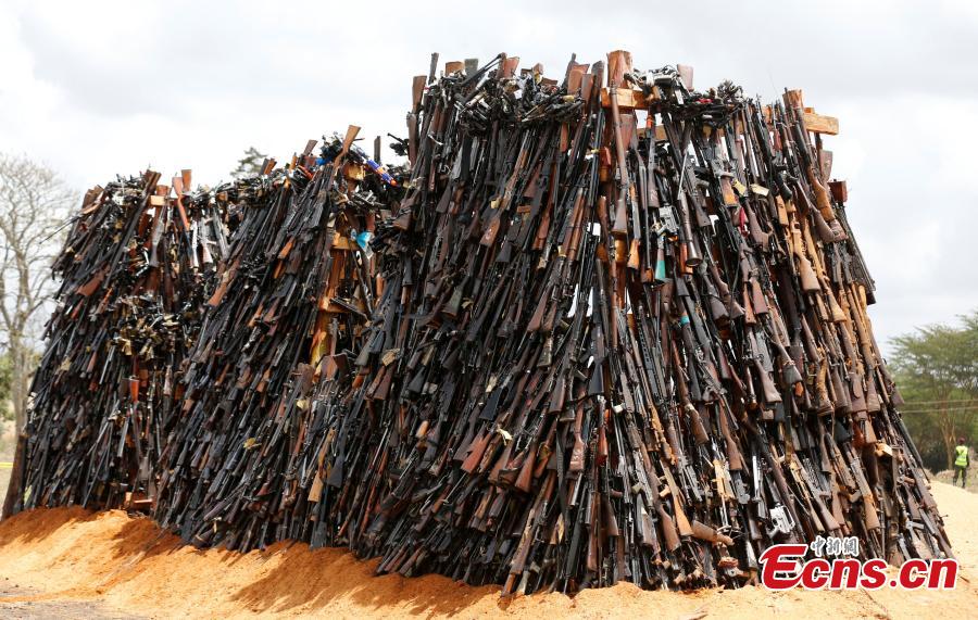 An assortment of 5,250 illicit firearms and small weapons, recovered during various security operations burns during its destruction in Ngong hills near Kenya's capital Nairobi, November 15, 2016.(Photo/Agencies)