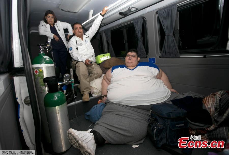 32-year-old Juan Pedro Franco, who weighs almost 500 kg, arrives at the hospital in Guadalajara, Mexico on November 15, 2016. Franco, reportedly the world's heaviest living man, has left his bed for the first time in years in order to seek treatment.(Photo/Agencies)