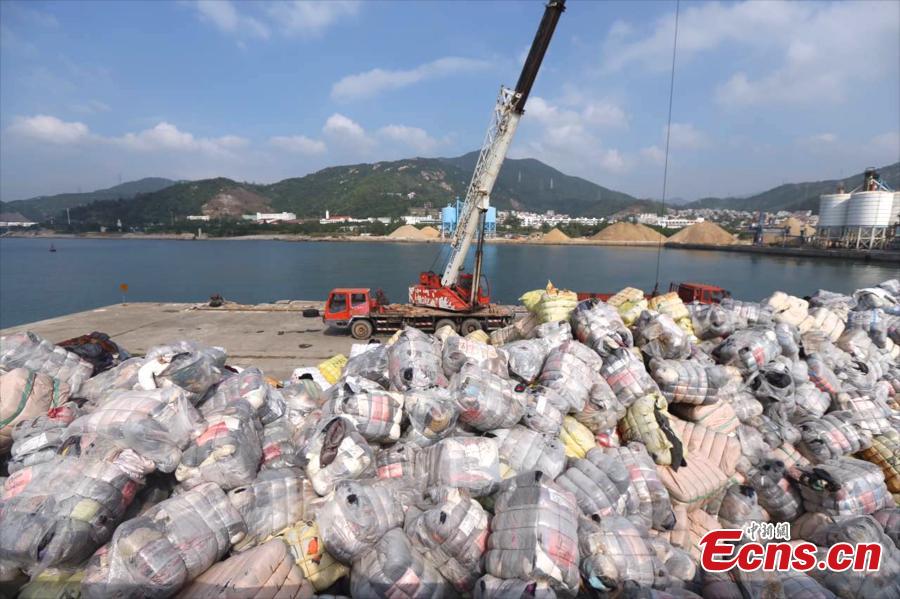 Packaged old clothes are being transported for incineration from Tuyang port in Shenzhen, South China's Guangdong Province, Nov. 17, 2016. Shenzhen Customs destroyed 1,046 tons of discarded clothes at Yantian and Nanshan waste incineration power plants on Thursday. The smuggled clothes were intercepted by local frontier police force in June and September. (Photo: China News Services/Chen Wen)