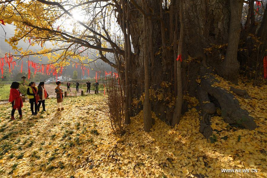 Photo taken on Nov. 19, 2016 shows a ginkgo tree in Yuhuangmiao Township of Liuba County, northwest China's Shaanxi Province. The 29-meter-tall ginkgo tree attracted many tourists in autumn. (Xinhua/Tao Ming)