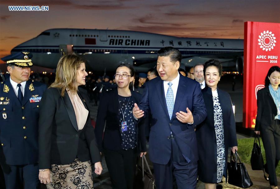 Chinese President Xi Jinping (L) and his wife Peng Liyuan arrive in Lima, Peru, Nov. 18, 2016. Xi arrived in Peru Friday to attend the upcoming Asia-Pacific Economic Cooperation (APEC) Economic Leaders' Meeting and pay his first state visit to Peru. (Photo/Xinhua)