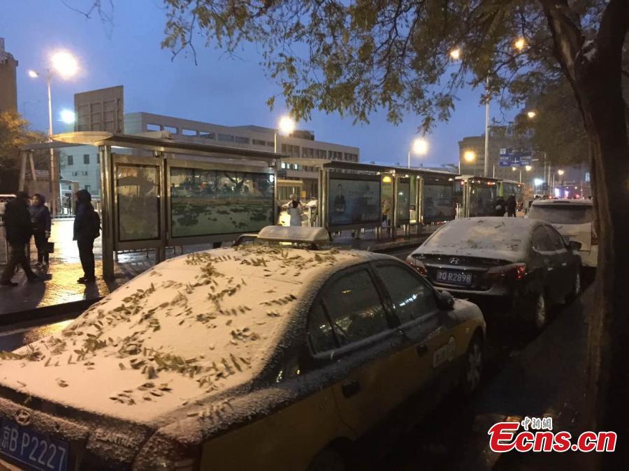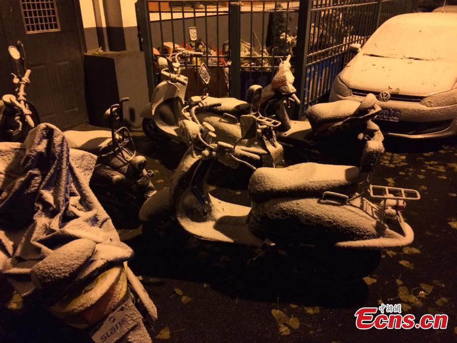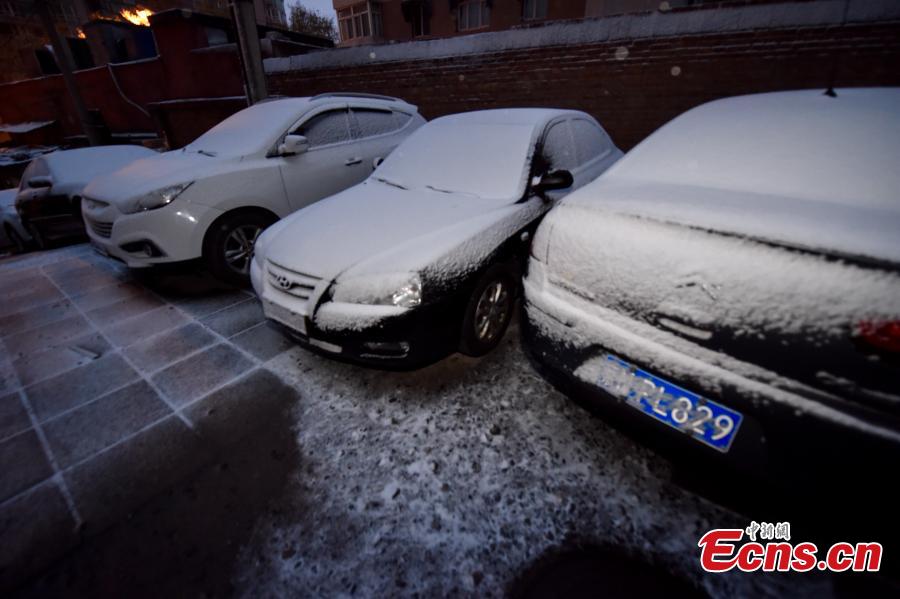 Vehicles are covered with snow as the city embraces the first snow of 2016 on Nov. 21, 2016. (Photo: China News Service/Jin Shuo)