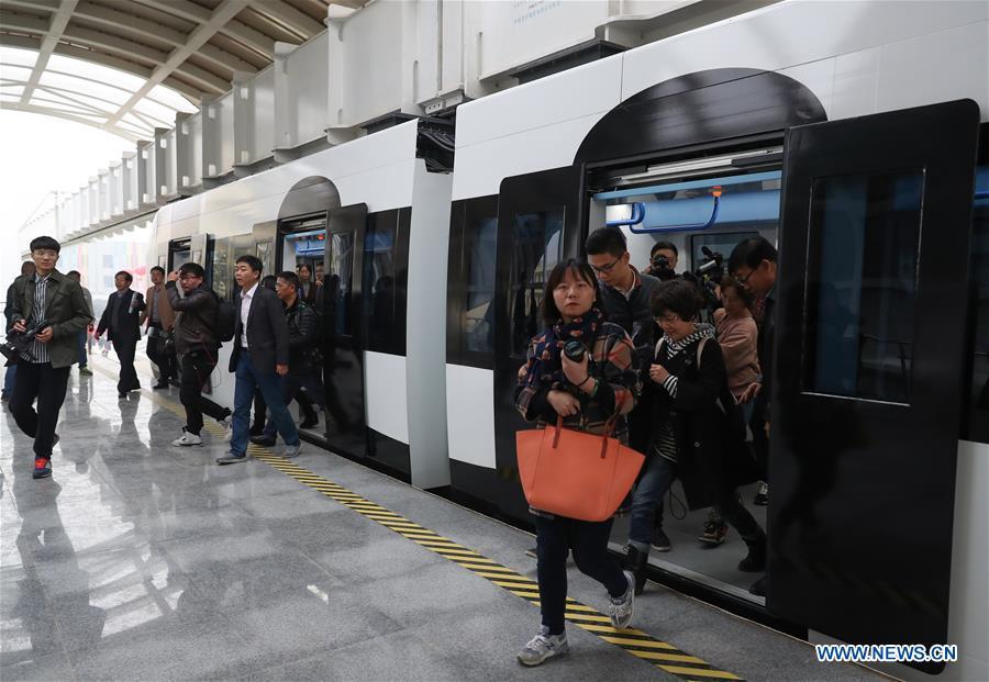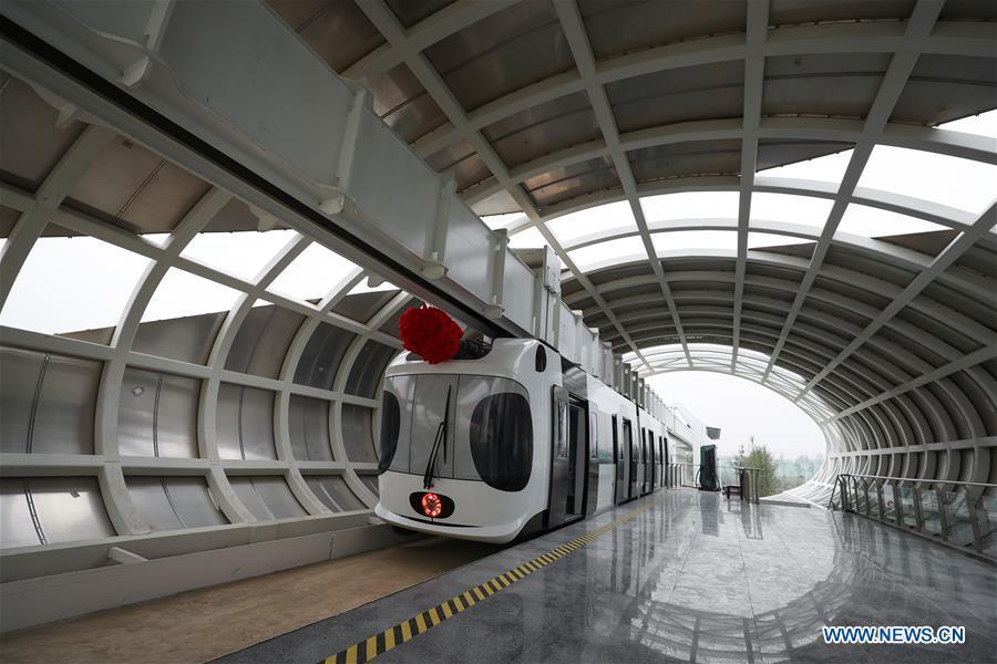 A train suspended from a railway line runs in Chengdu, capital of southwest China's Sichuan Province, Nov. 21, 2016. After two months of tests, China's first suspension railway line met all designed requirements and it is ready for more systematic operations. (Photo/Xinhua)