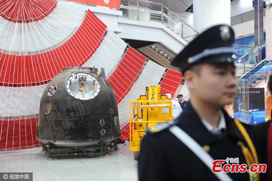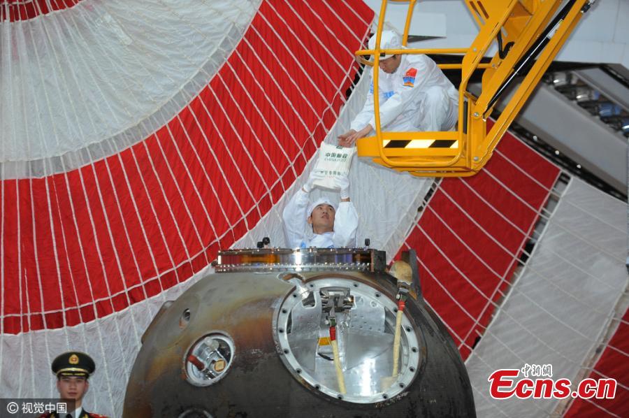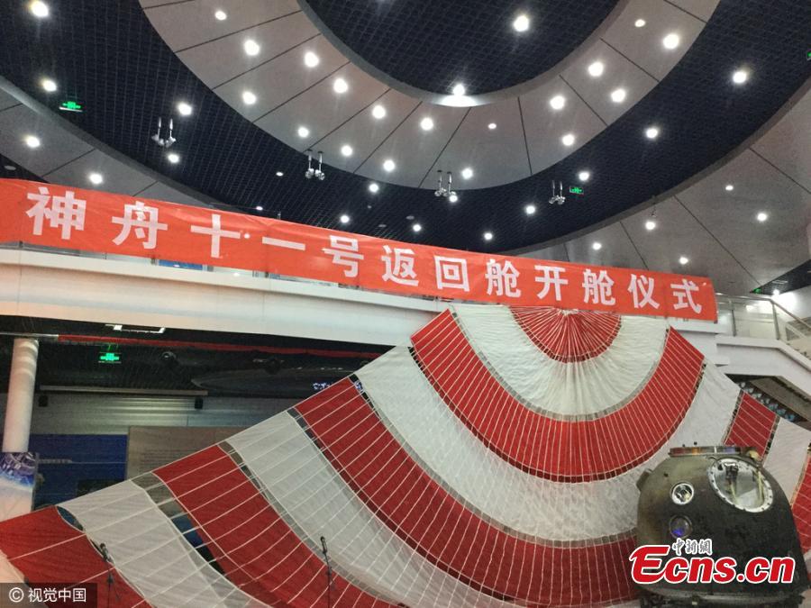 A ceremony is held in Beijing to open the space capsule of Shenzhou XI manned mission on Nov 22, 2016, unveiling the items that were carried by the two Chinese astronauts Jing Haipeng and Chen Dong during their 33-day space trip. (Photo/CFP)