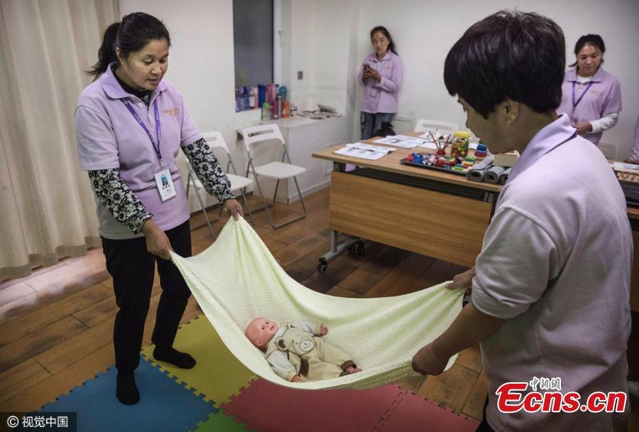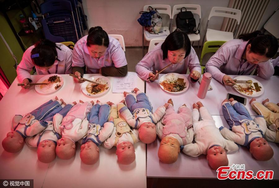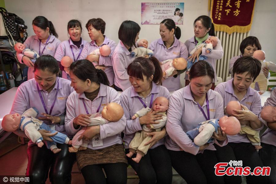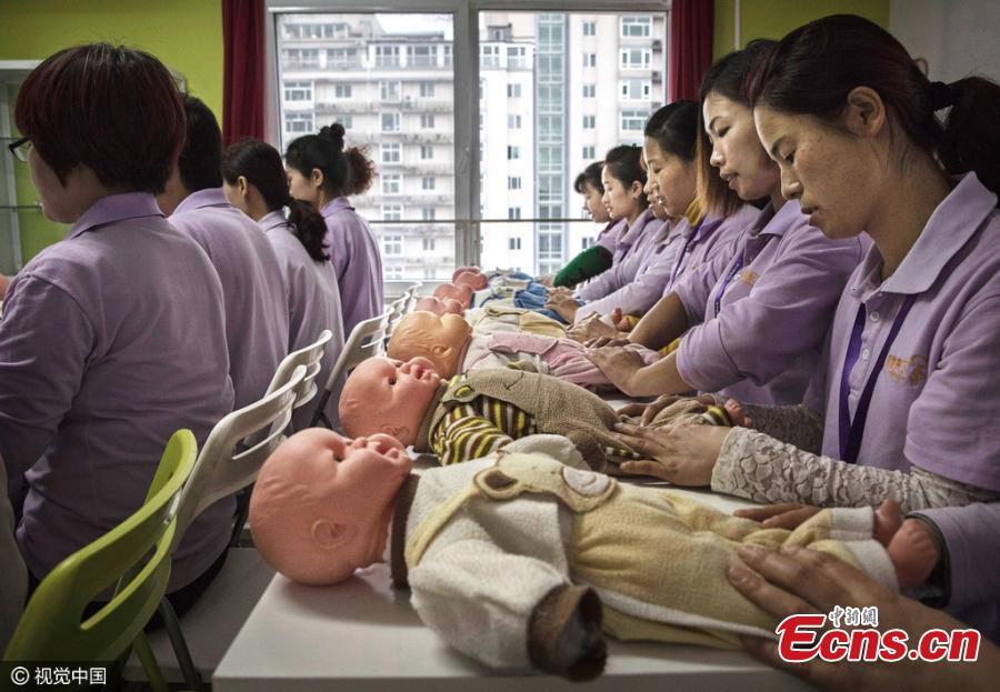 Women train with toy babies at a maternity matron school in Beijing in Novemebr, 2016. Trainees can get their vocational qualification certificates and become postnatal attendants after an 8-day training project which costs 1,700 yuan ($246.6). A postnatal attendant, or yuesao in Chinese, encompasses the role of nanny, nurse, cook and pre-school teacher. During peaks in birthrates, the demand for the service usually exceeds supply.(Photo/CFP)