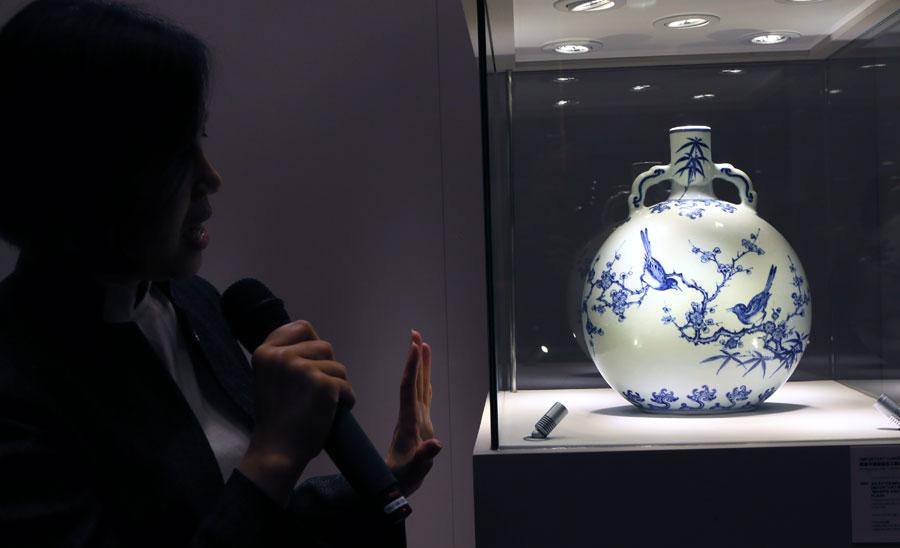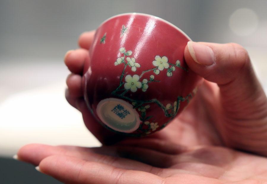 An enamel cup made during the reign of Emperor Yongzheng of Qing Dynasty (1644-1911) is showcased at an auction preview of the Christie's on Nov 23, 2016. The cup will go under the hammer with an estimated value of HK$50 million ($6.5 million) at the Christie's 2016 Autumn Auction from Nov 25 to 30. Items in the auction list include masterpieces of Chinese paintings and calligraphy, porcelain wares and handicrafts, as well as jewelries and wristwatches. (Photo/Xinhua)
