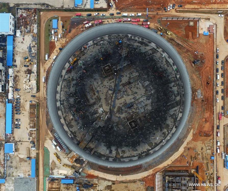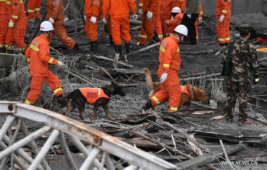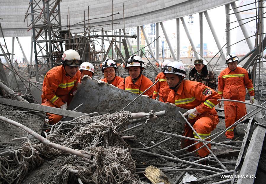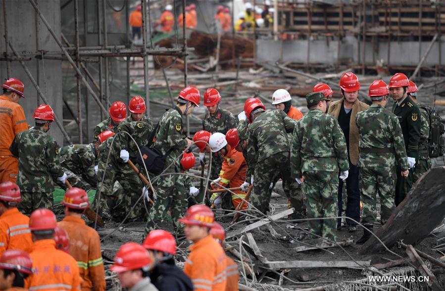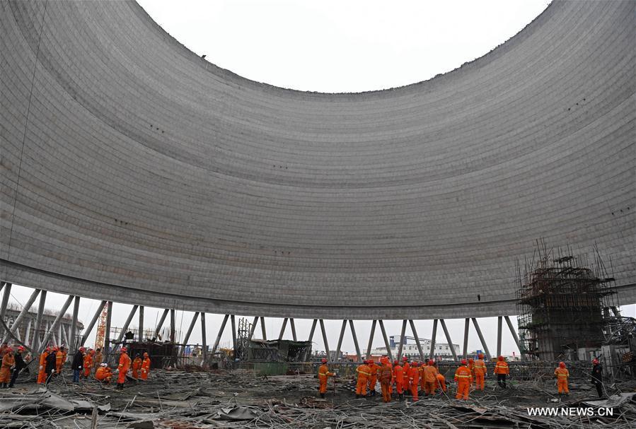 Rescuers work at the accident site at the Fengcheng power plant in Yichun City, east China's Jiangxi Province, Nov. 24, 2016. Sixty-seven people have been confirmed dead and another missing as a platform of a power plant's cooling tower under construction collapsed in Jiangxi Thursday, rescuers said. (Photo: Xinhua/Wan Xiang)