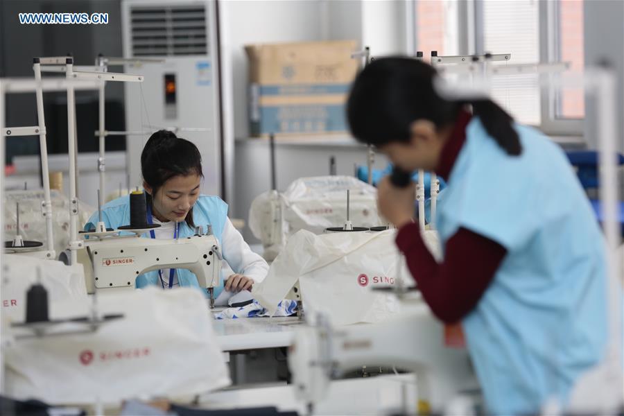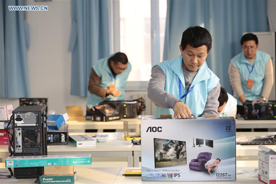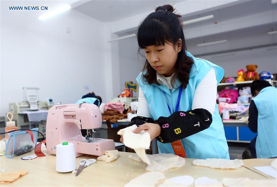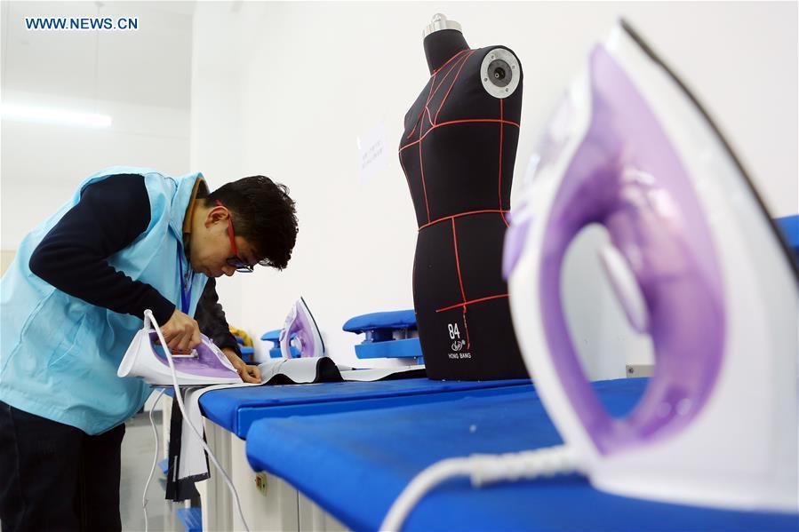 A man takes part in a fashion-design match during a disabled youth vocational skill contest at the Tianjin University of Technology in Tianjin, north China, Nov. 26, 2016. (Xinhua/Liu Dongyue)