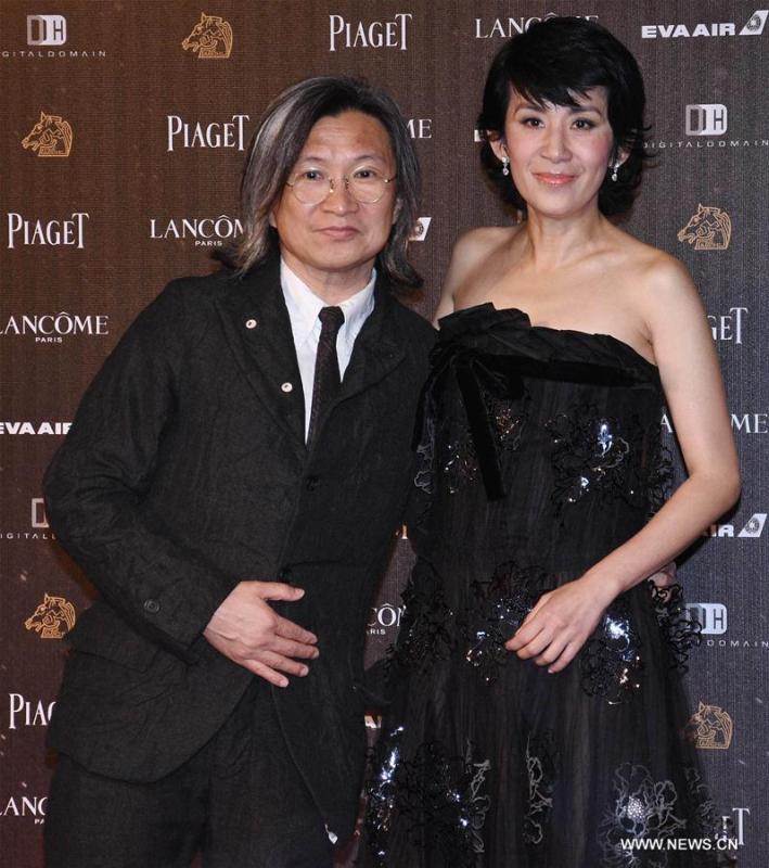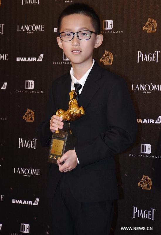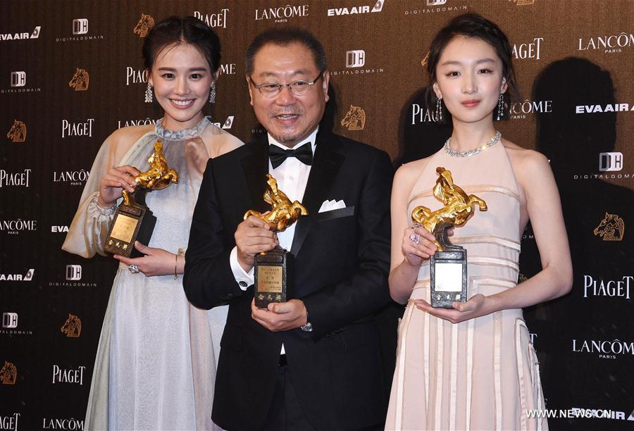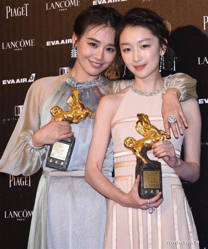Best Leading Actress award winners Zhou Dongyu (R) and Ma Sichun (L) and Best Leading Actor award winner Fan Wei pose for photos at the 53rd Golden Horse Awards in Taipei, southeast China's Taiwan, Nov. 26, 2016. The awarding ceremony of the 53rd Golden Horse Awards was held here on Saturday. (Photo/Xinhua)