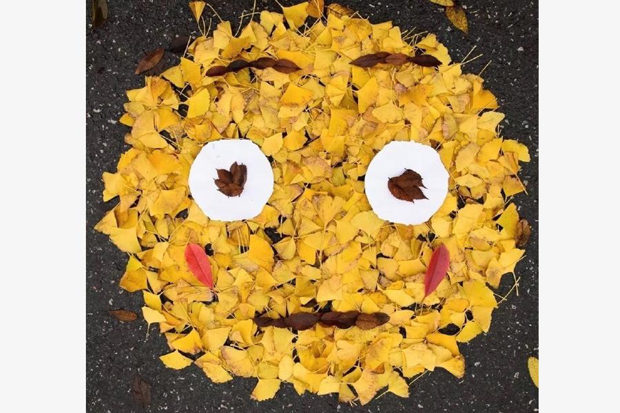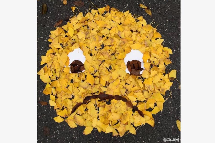 College students of Nanjing University of Aeronautics and Astronautics collect fallen leaves and shape them into emojis. The picture shows the “naughty” emoji. (Photo/Xinhua)
