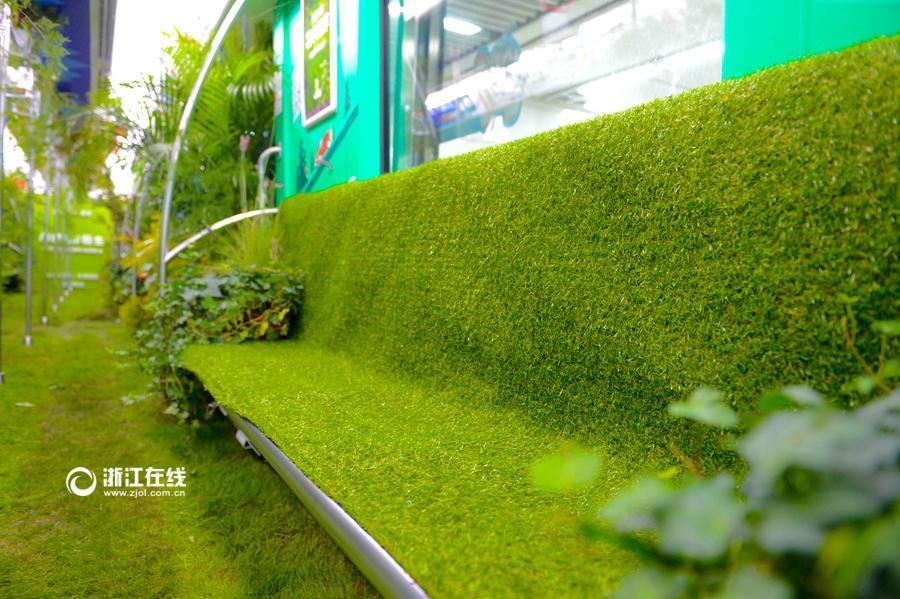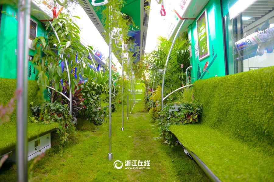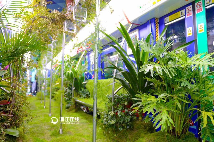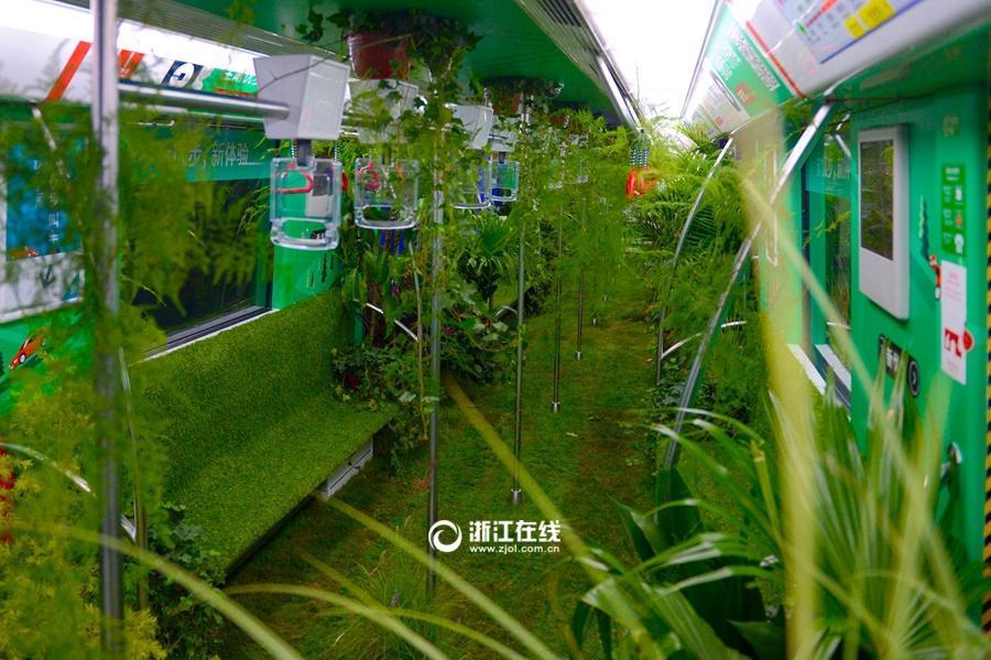 The subway Line 1 in Hangzhou, east China's Zhejiang Province moves "forest" into the carriage, on November 28, 2016. Scenes of green plants with the smell of fresh show the concept of low-carbon life. (Photo/Zjol.com)