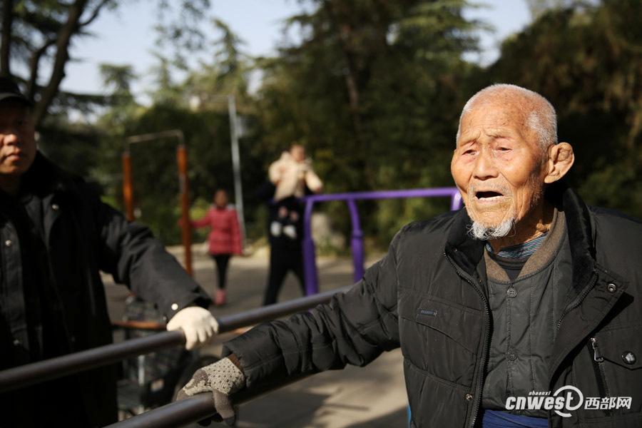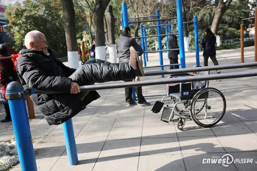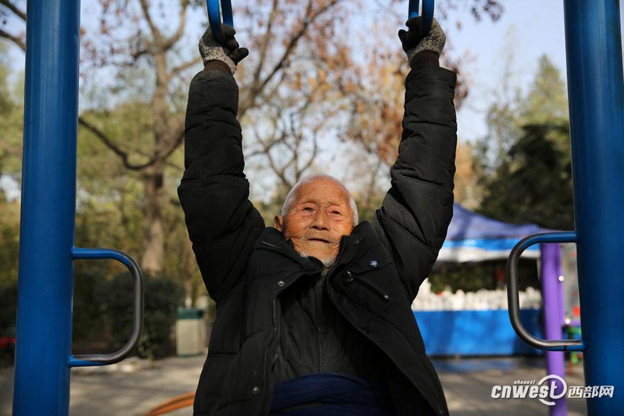 Yang Maolin, 101, exercises in Revolution Park in Xi'an, Shaanxi province, Nov. 26, 2016. (Photo/cnwest.com)