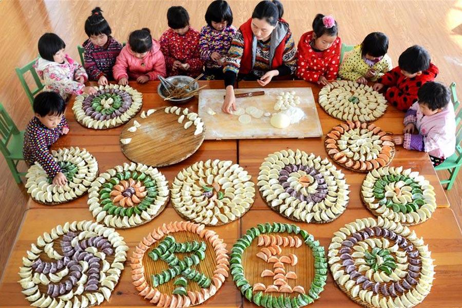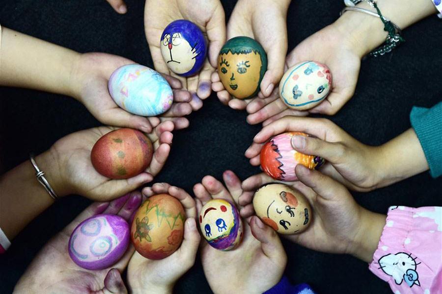 Pupils display painted eggs during a folk custom activity marking "lixia", the beginning of summer in Chinese lunar calendar, at a primary school in Hefei, capital of East China's Anhui province, May 5, 2016. (Photo/Xinhua)
