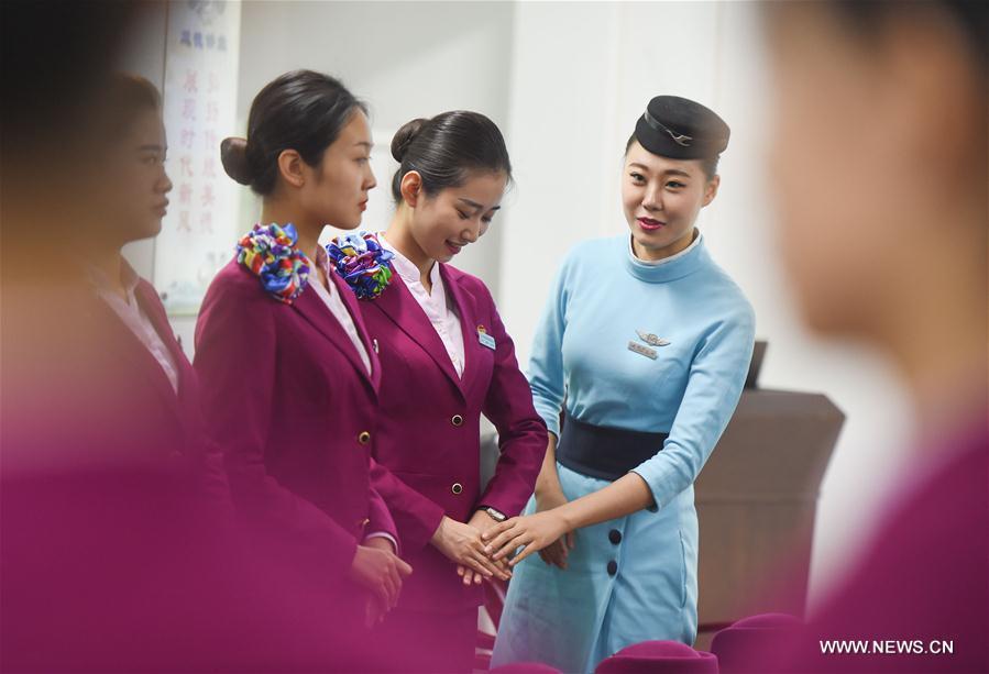 A flight attendant (R, front) and high-speed train attendants attend a training session in Xiamen, Southeast China's Fujian province, Dec 1, 2016. Attendants from Xianmen Airlines and Nanchang Railroad Bureau attended a training session for the upcoming Spring Festival travel rush. (Photo/Xinhua)