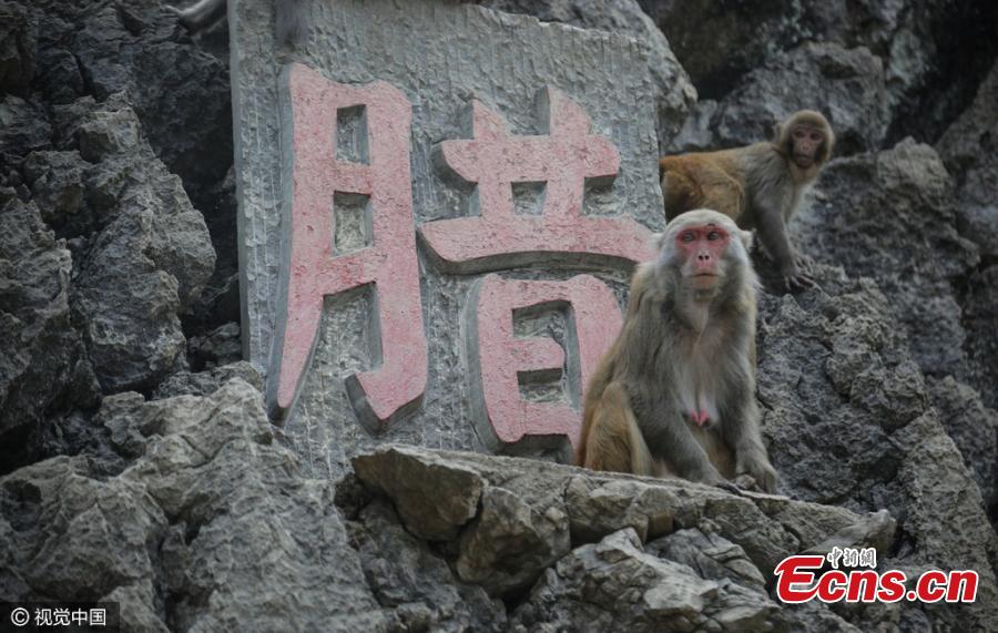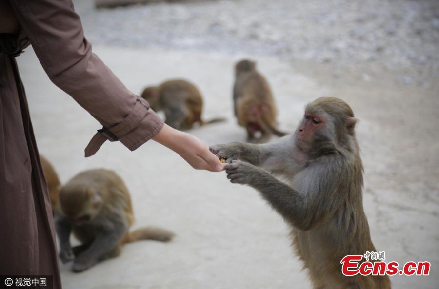 A man feeds monkeys in Jiulong village in Guangxi Zhuang Autonomous region on December 3, 2016. Residents of the village once besieged by wild macaques started to convert cultivated land into forests and domesticate the animal 20 years ago. Now the region is home to over 400 monkeys. The macaque is listed as a second-class animal with State protection. (Photo/CFP)