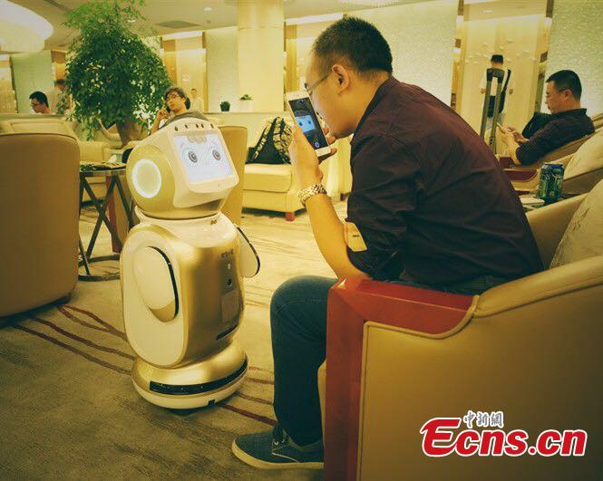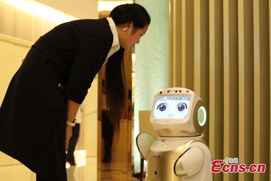 A woman talks with a robot in a passenger lounge in Shenzhen, South China’s Guangdong province on December 5, 2016. China's Shenzhen Airlines has introduced 16 robots to serve in passenger lounges beginning Dec. 5. The robots, named "Zunpeng Xiaobao," are able to directly interact with passengers. The robots can reportedly talk, dance, tell stories and play music. According to an employee with Shenzhen Airlines, the robot can provide consultations, guidance and entertainment. Shenzhen Airlines hopes to improve the passenger experience with this diversified, intelligent and personalized service. (Photo: China News Service/ Li Yan)