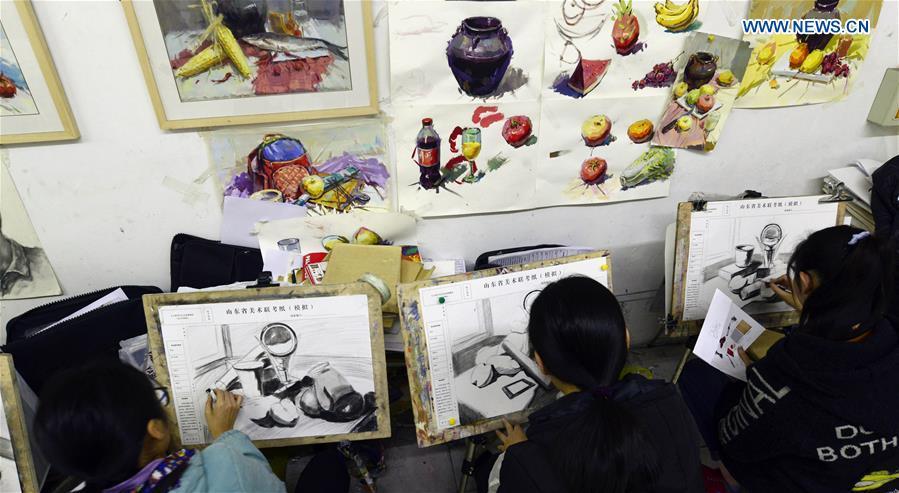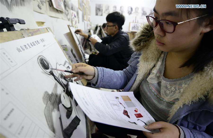 Students practice at a painting school in Jinan, capital of east China's Shandong Province, Dec. 12, 2016. Art students carried out final training recently for the upcoming 2017 entrance examination for art majors in colleges in Shandong Province on Dec. 18. (Photo:Xinhua/Zhao Xiaoming)