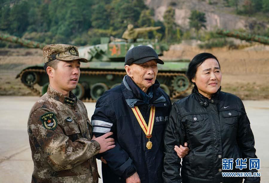 Qian Jianmin, a 92-year-old veteran who was blinded during the War of Resistance against Japanese Aggression, has finally realized his long-cherished dream of touching a modern armored vehicle. Accompanied by his daughter and PLA soldiers, Qian visited an armored troop in Jiangsu province on Dec. 13, touching China's most advanced armored vehicle, the Type-99 tank. Six tanks honked their horns to pay tribute to Qian. Qian's wish received widespread public support after a volunteer posted it online, and many people contacted the military to help the deserving veteran. (Ji Chunpeng/Xinhua)